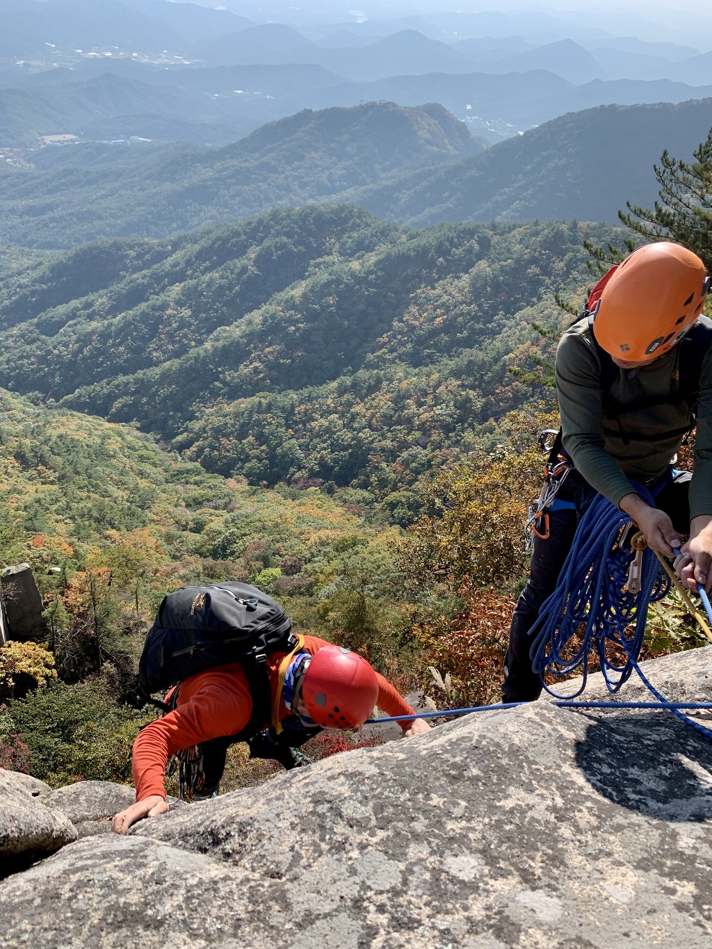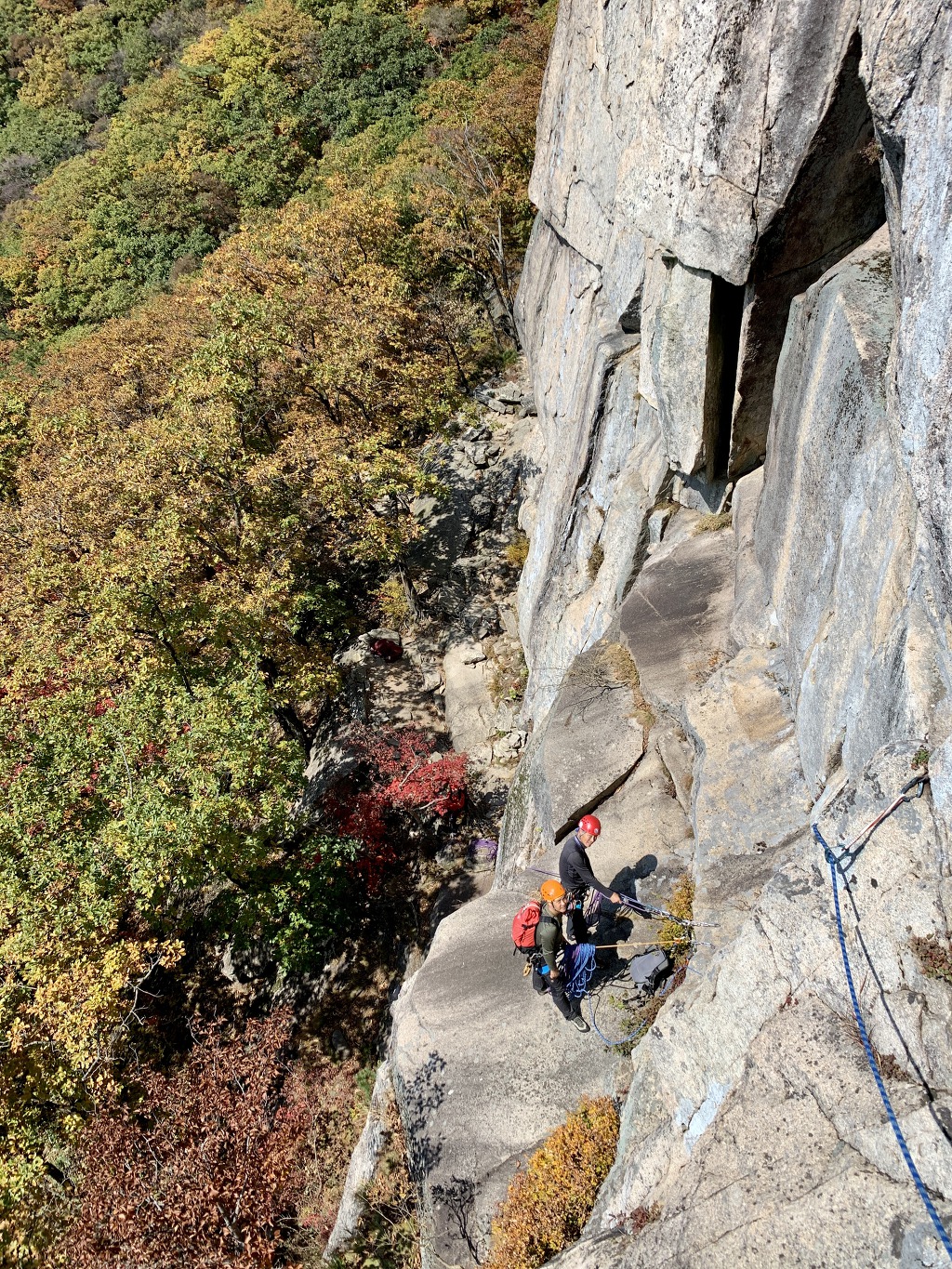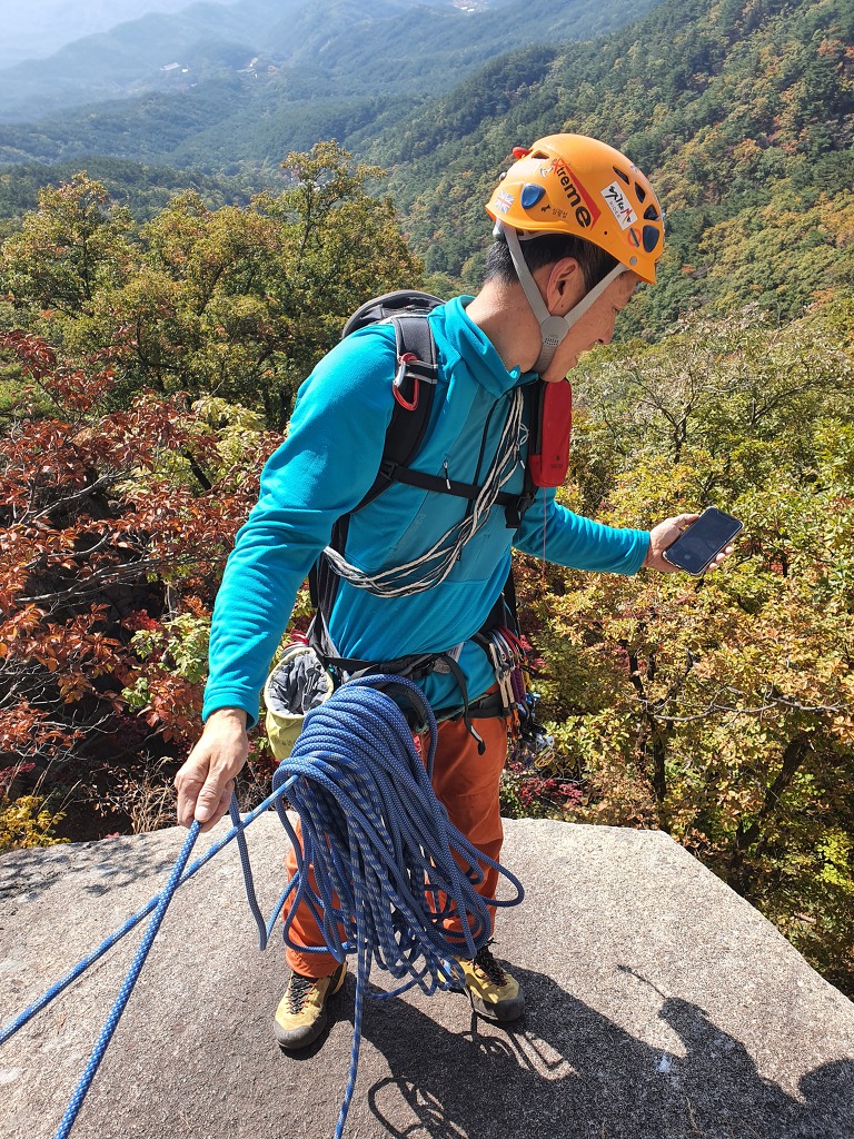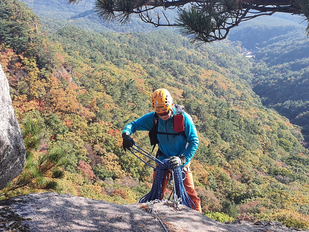 네 번째 피치의 횡단구간을 등반중인 나. 형형색색으로 물들어 가는 단풍이 아름다운 이 좋은 가을날에