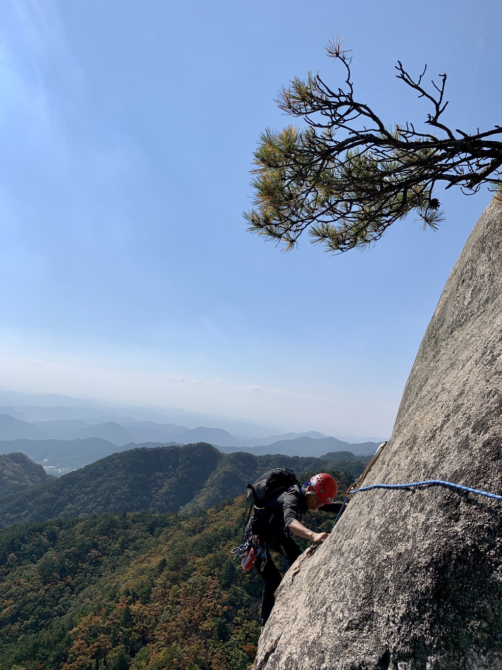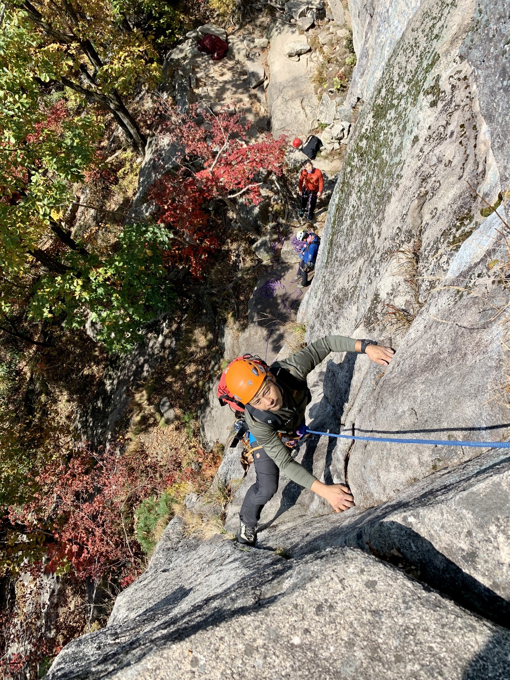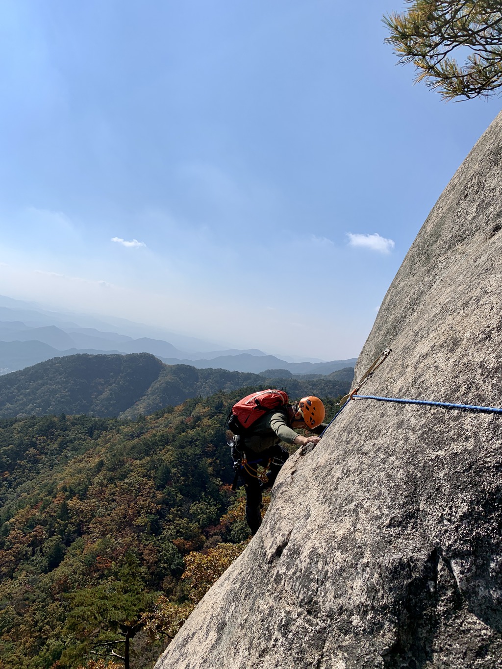 네 번째 피치의 횡단구간을 등반중인 나. 형형색색으로 물들어 가는 단풍이 아름다운 이 좋은 가을날에