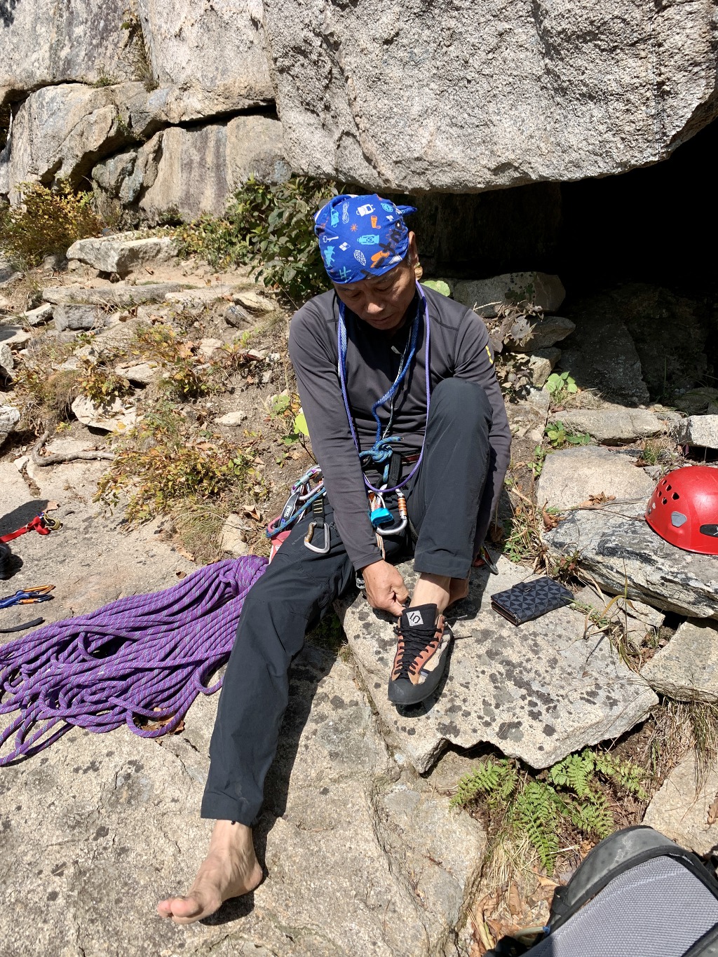 암벽화로 바꿔 신으며 결의를 다진다. 오랜만의 등반이라 긴장도 되는게 사실이다.