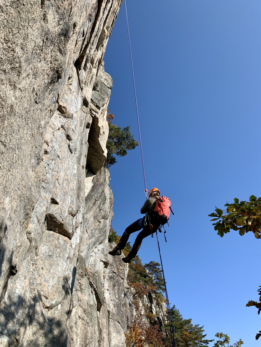이백리길의 하강은 약 45m정도 되는데 중간 지점부터는 오버행이라 공중에 뜬채로 내려간다.