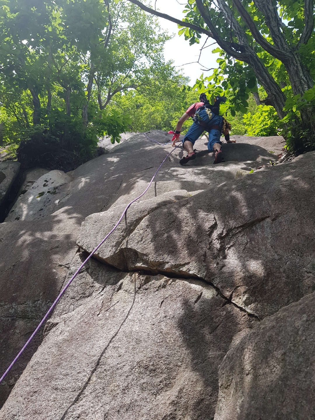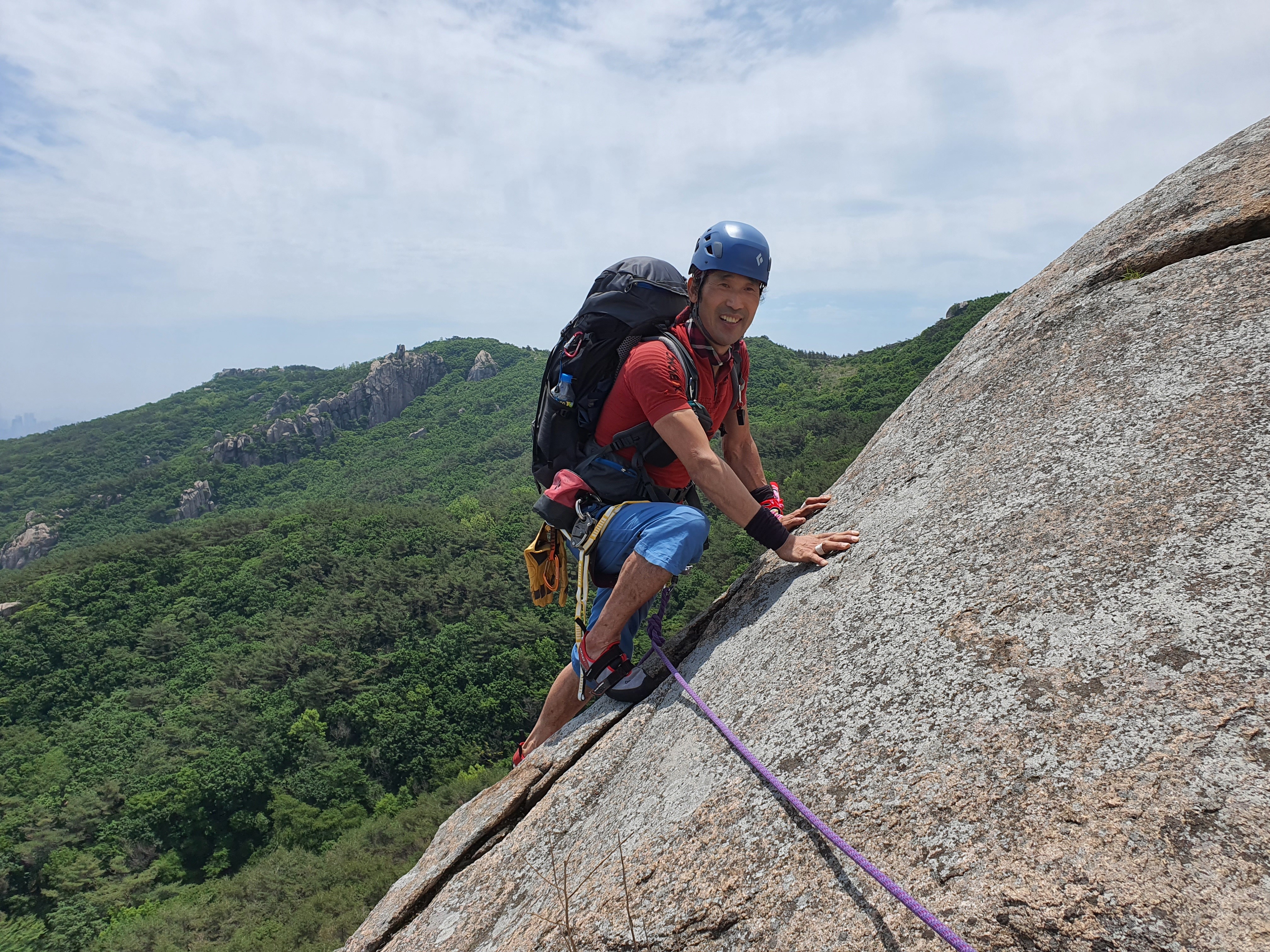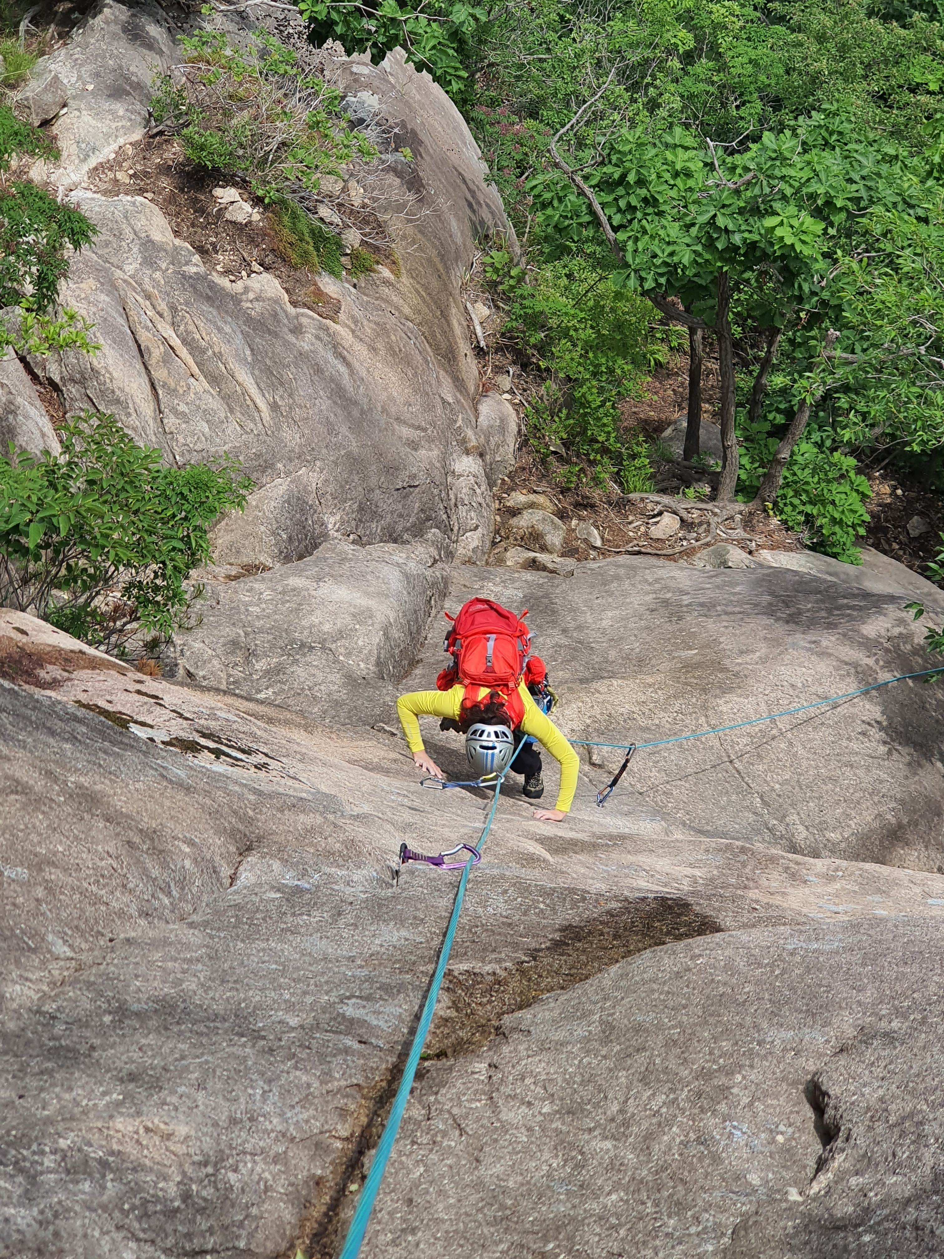 첫피치를 오르는 중~ 첫피치(5.8)는 중단부에서 부터 바위가 일어서며 보기보다 미끄럽고 각이 세다.