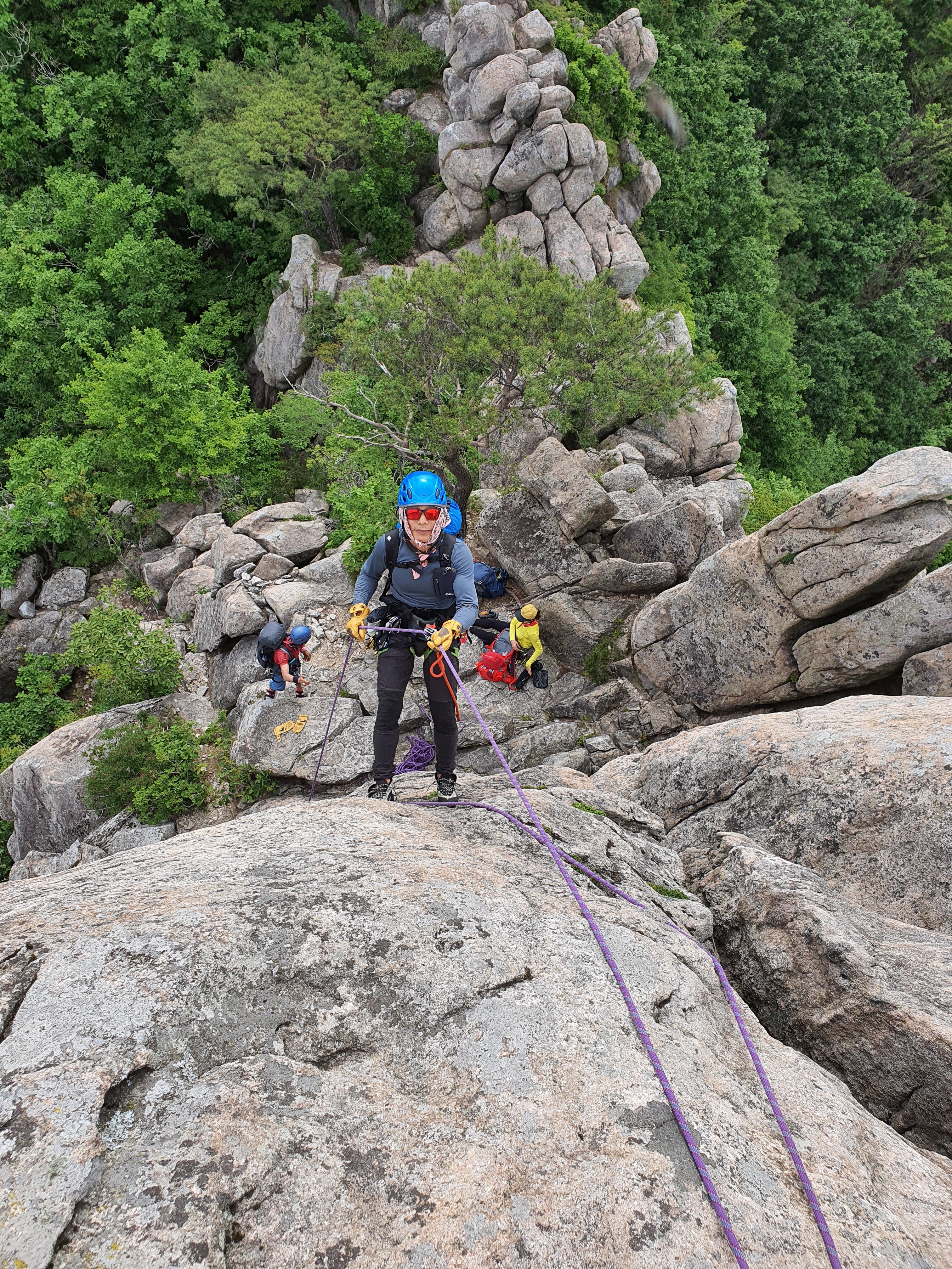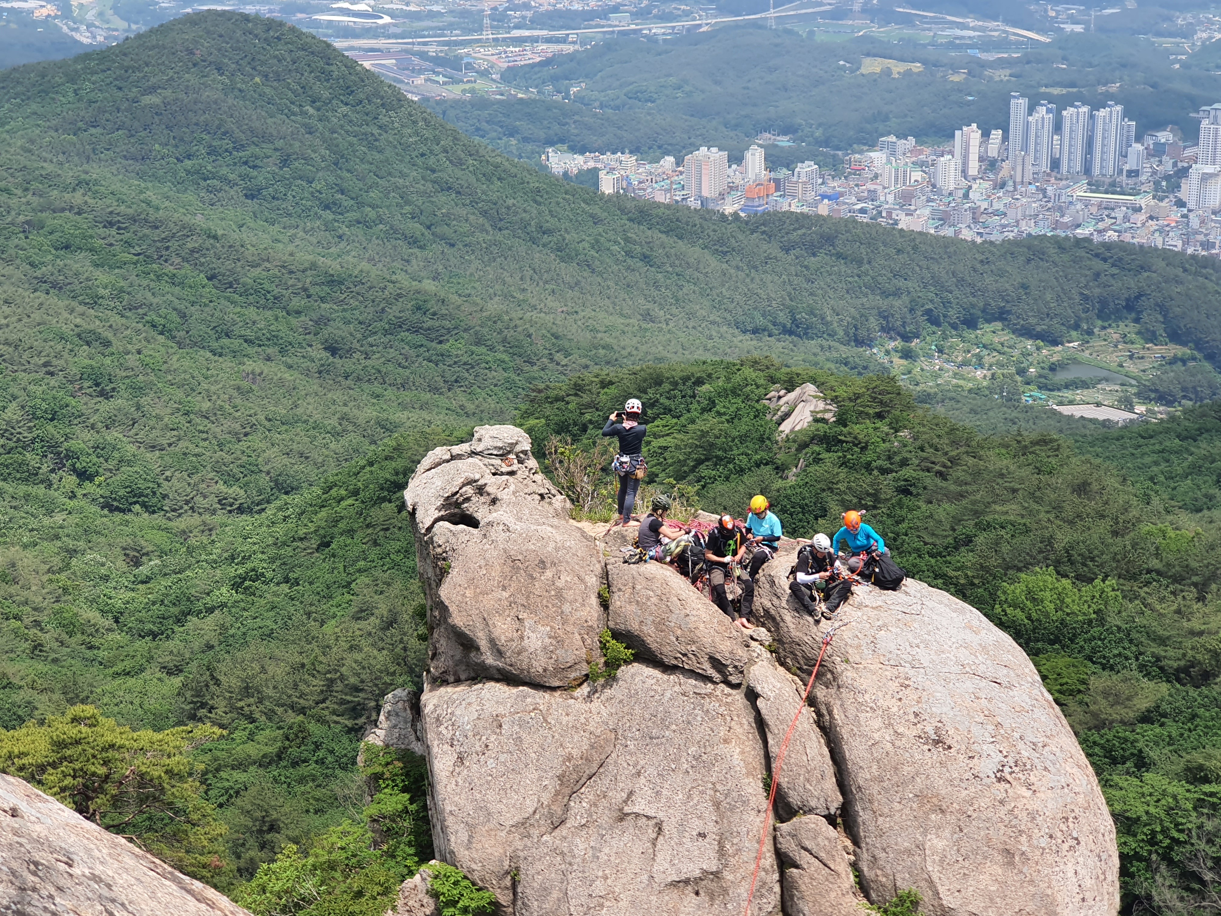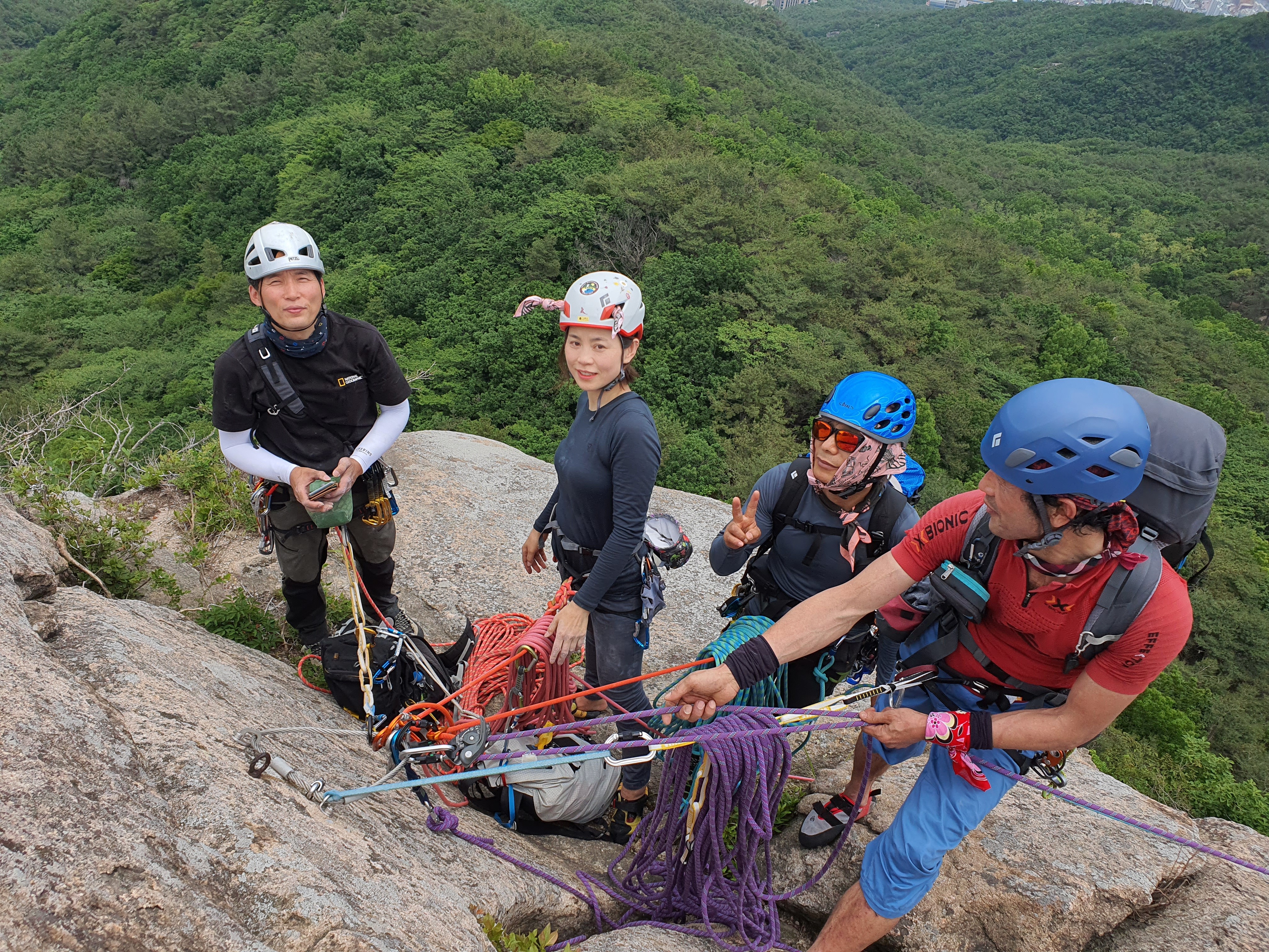 암봉의 정수리에 모인 대전분들~ 하강을 준비 중이다.