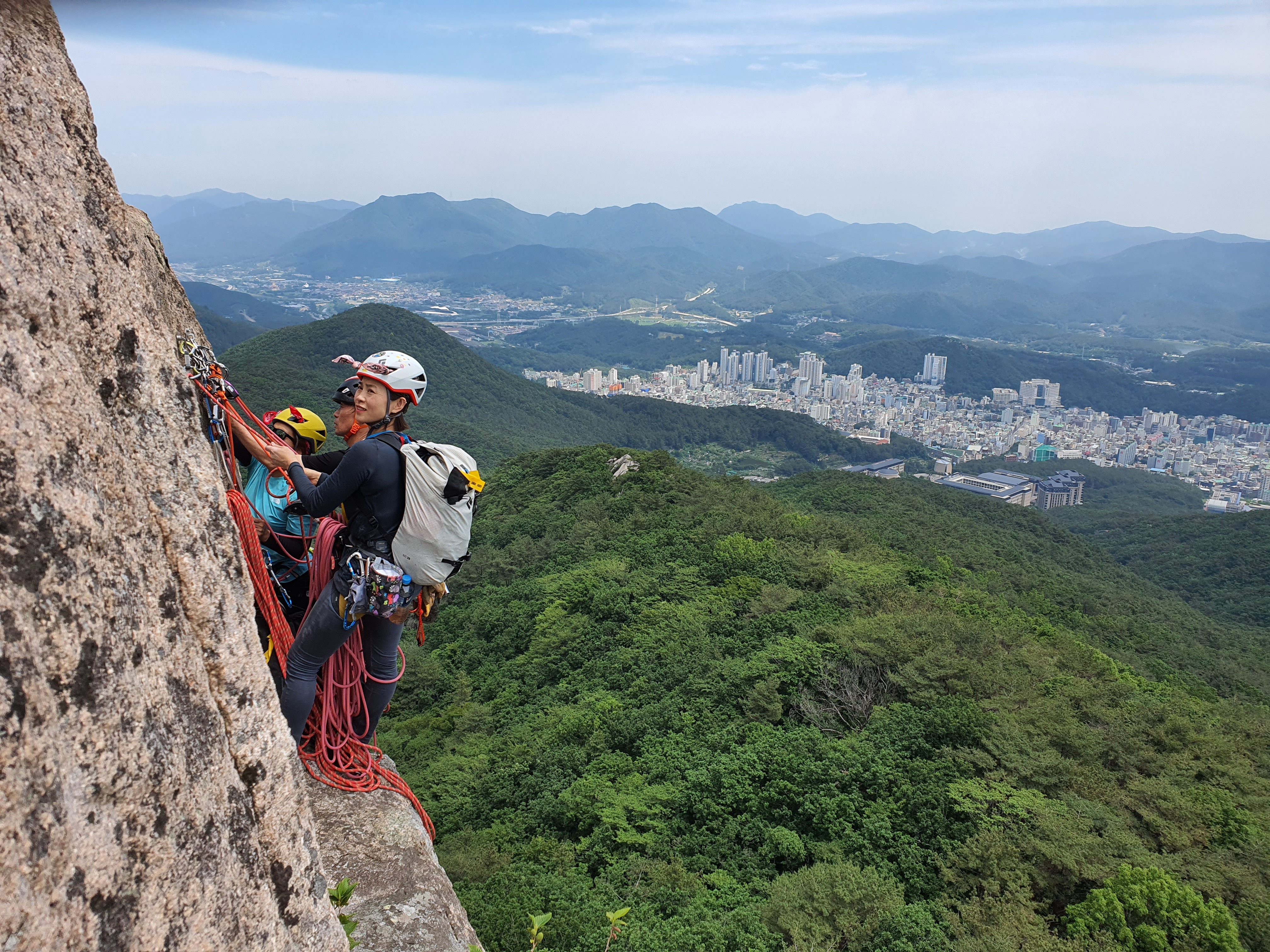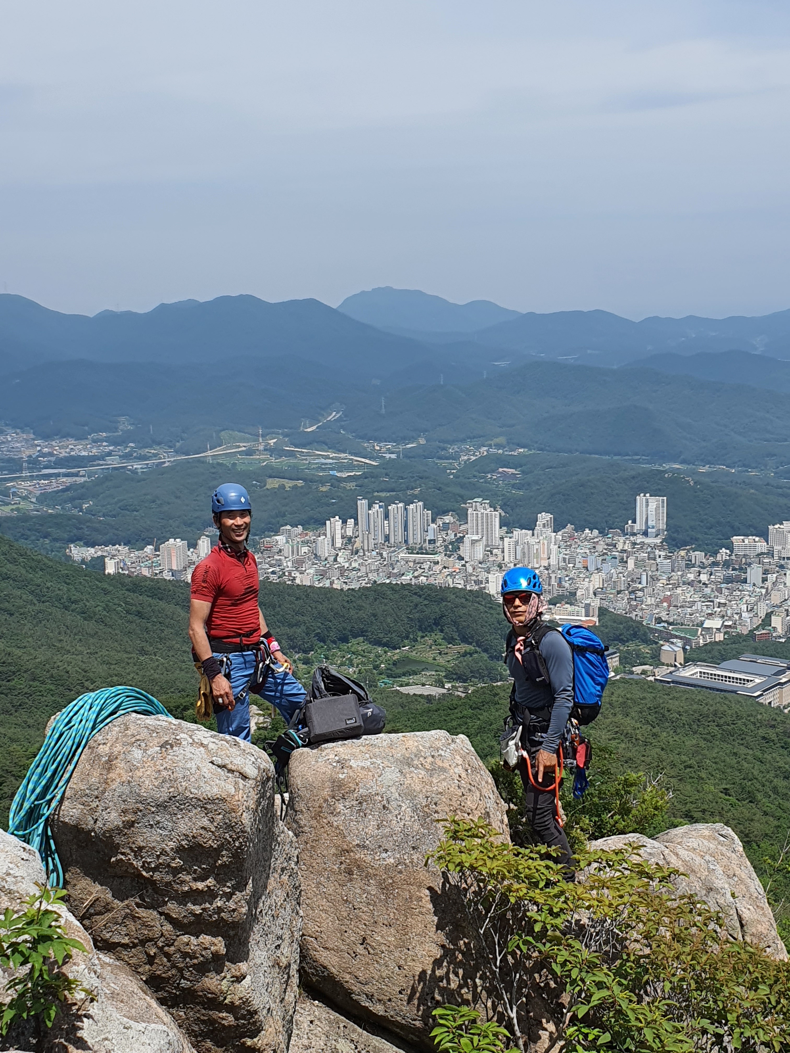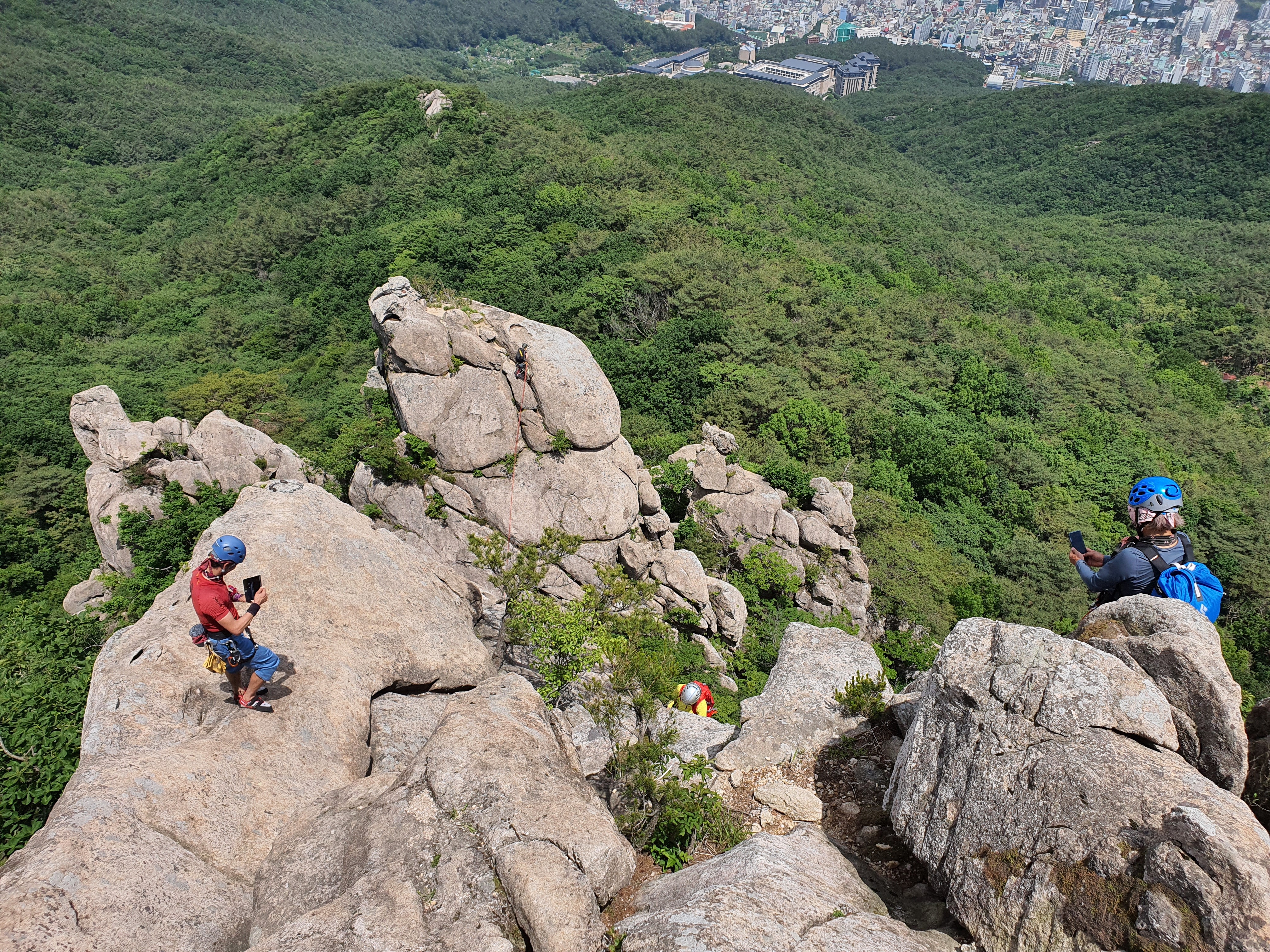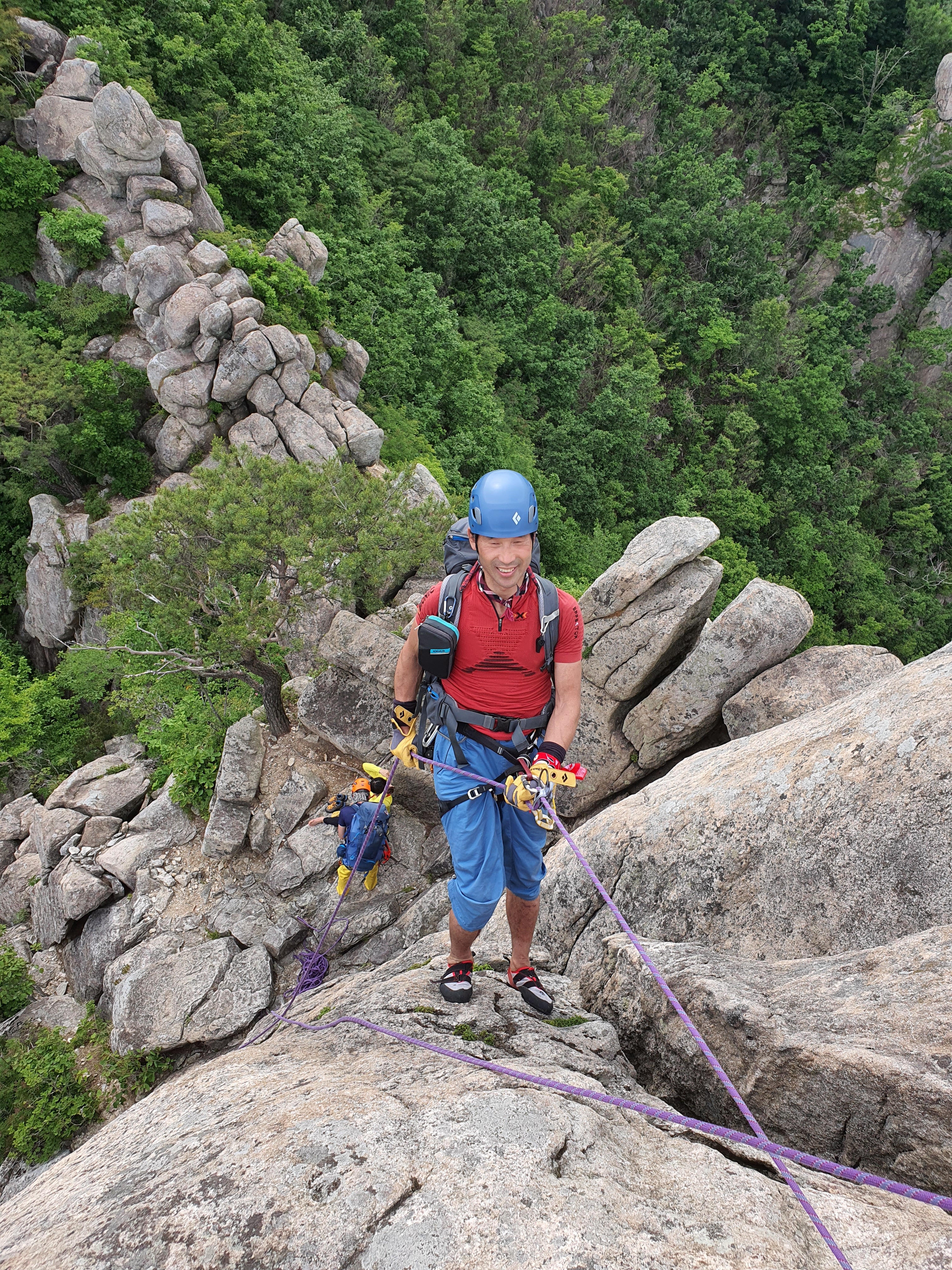암봉의 정수리에 모인 대전분들~ 하강을 준비 중이다.