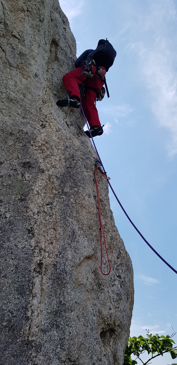 제7피치의 난이도 5.10급의 구간을 슬링을 이용하여 인공등반으로 오르고 있는 중이다.