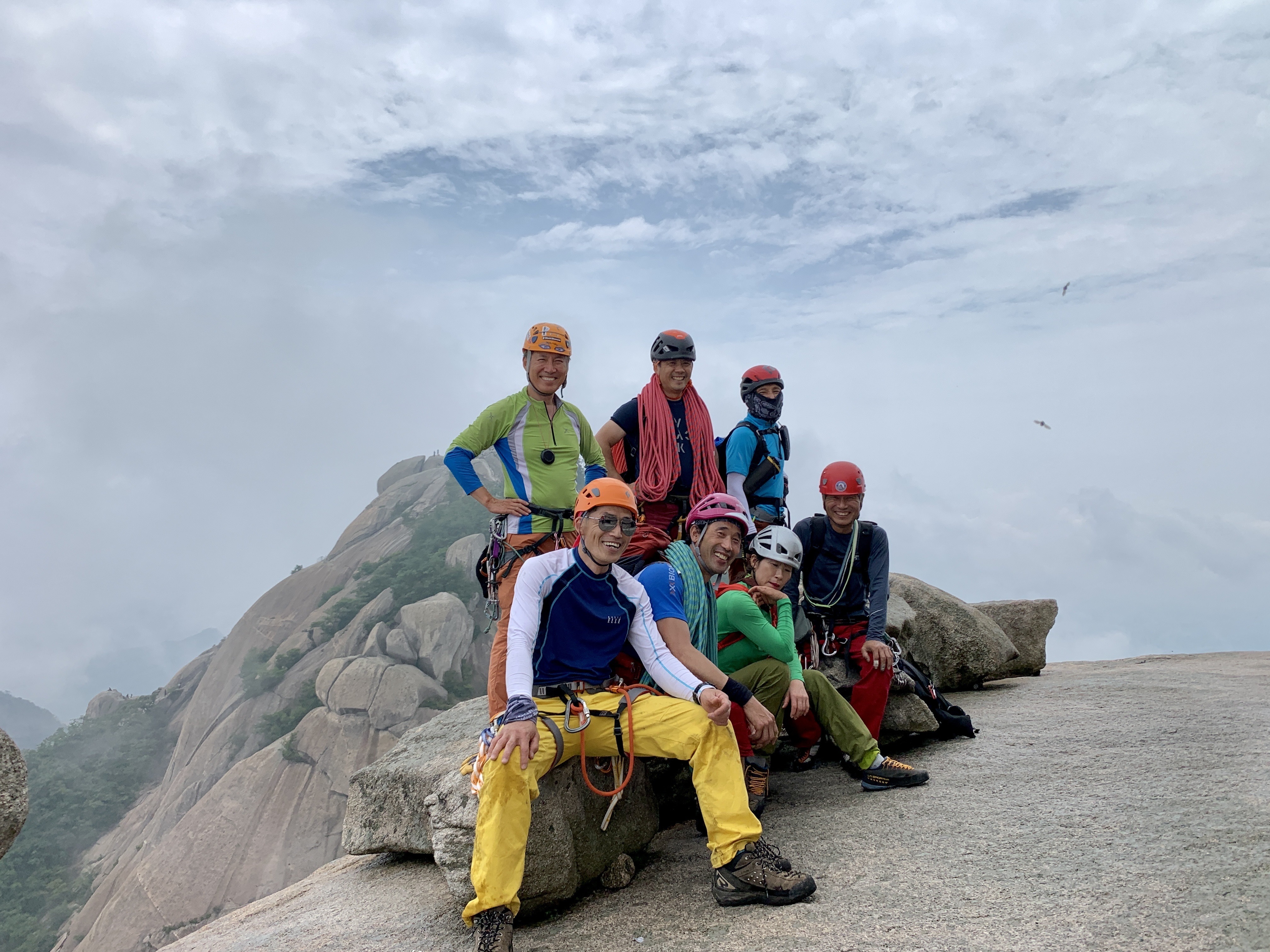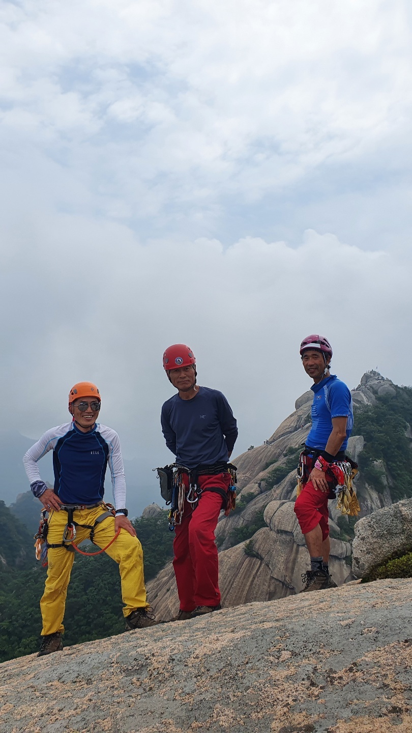 미끄러운 바위를 딛고 기어이 인수봉의 정상에 오른 우리 팀. 모두들 환희에 찬 표정들이다.