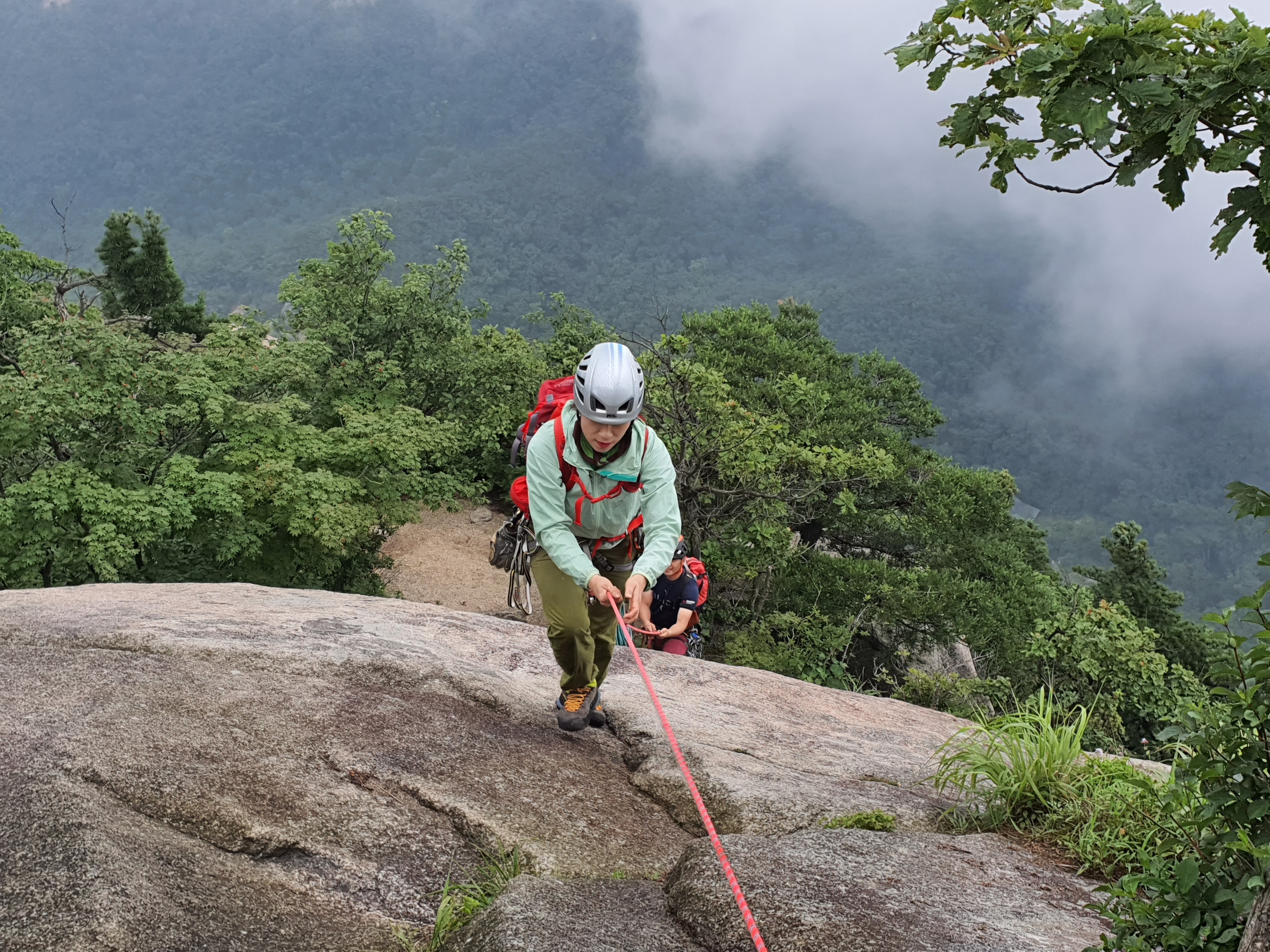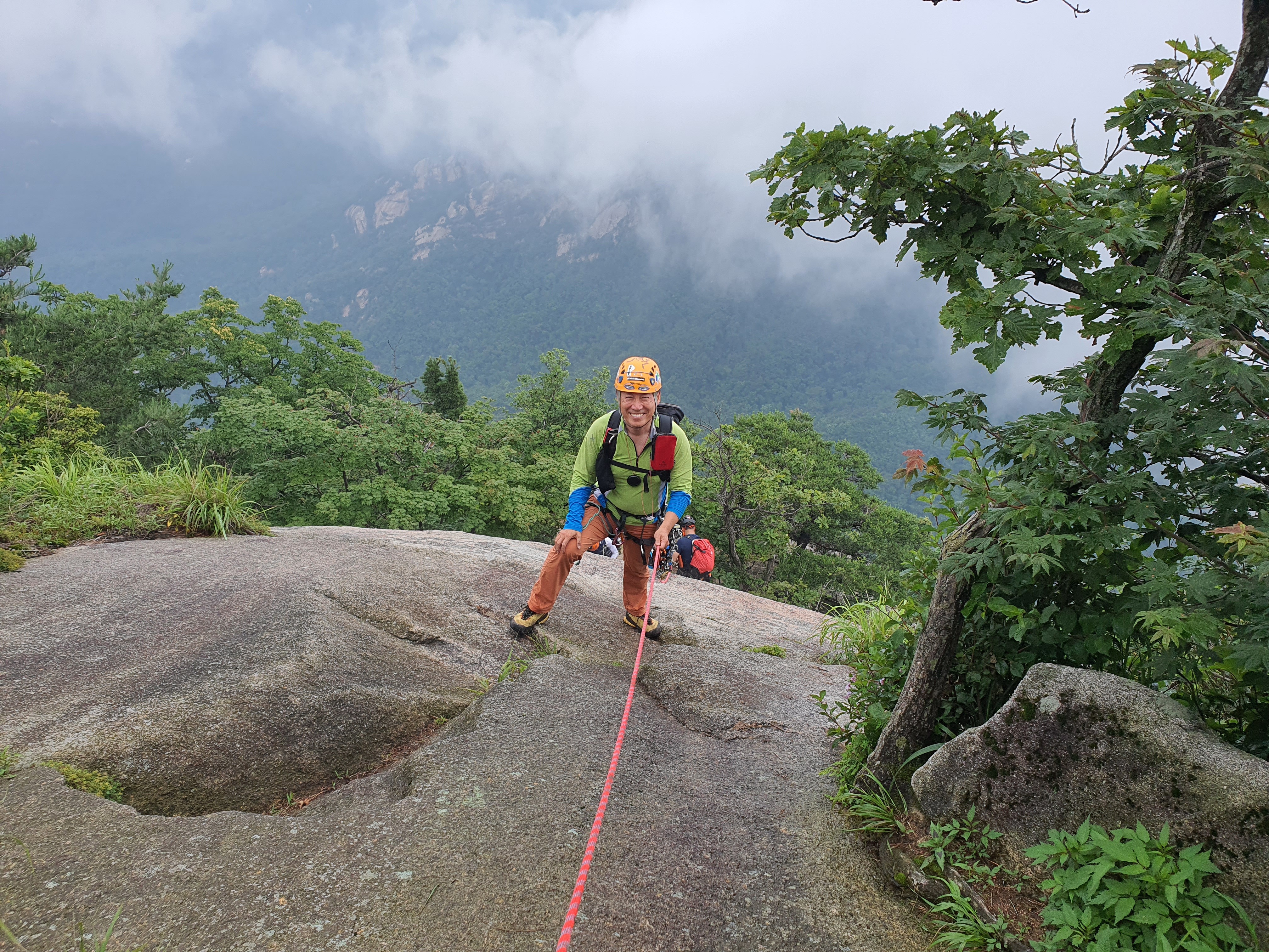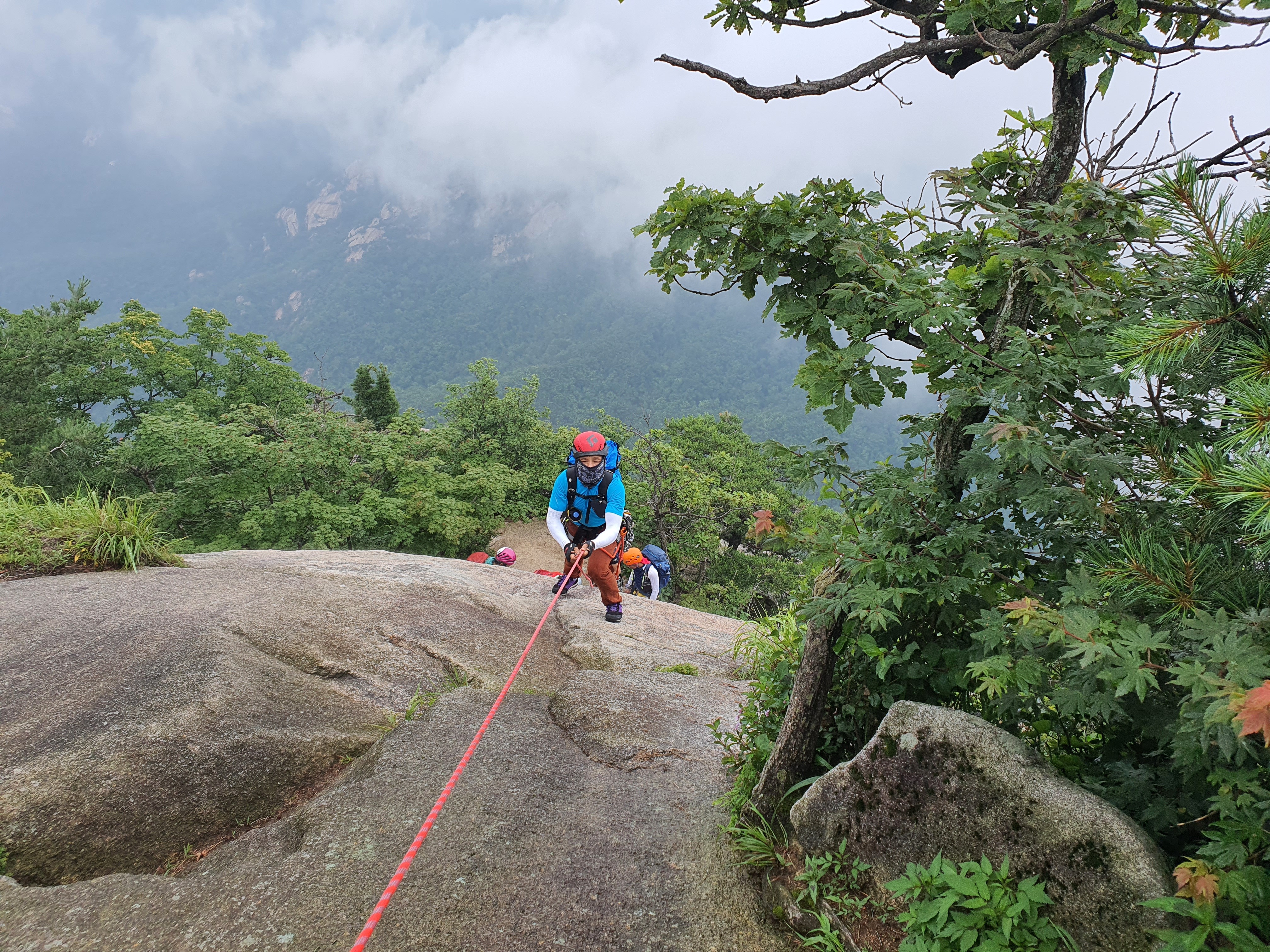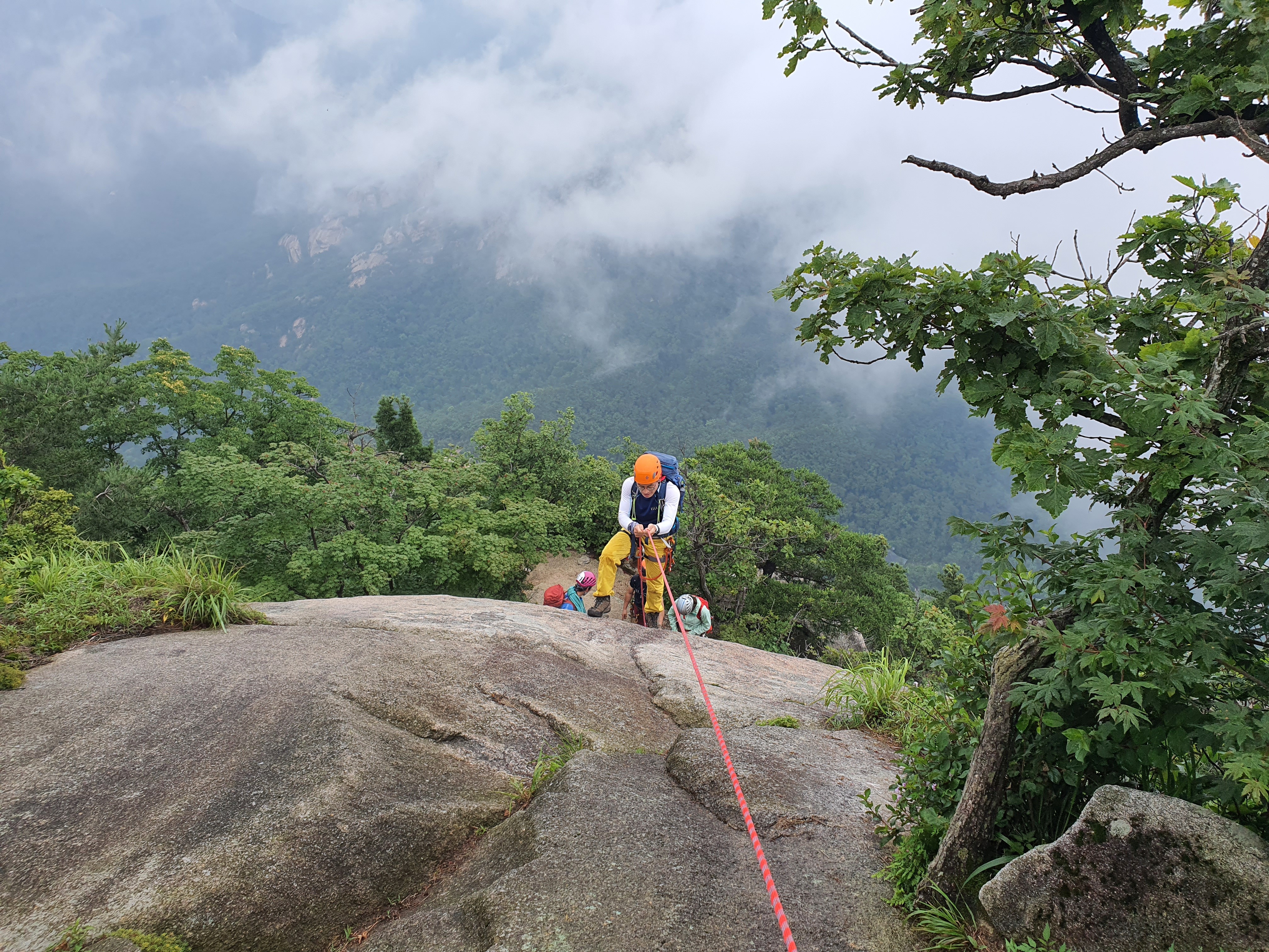 비에 젖은 참기름 바위는 얼마나 미끄러운지 사투끝에 밑에서 후배들이 발을 받쳐주어 겨우 내가 먼저 올랐다.