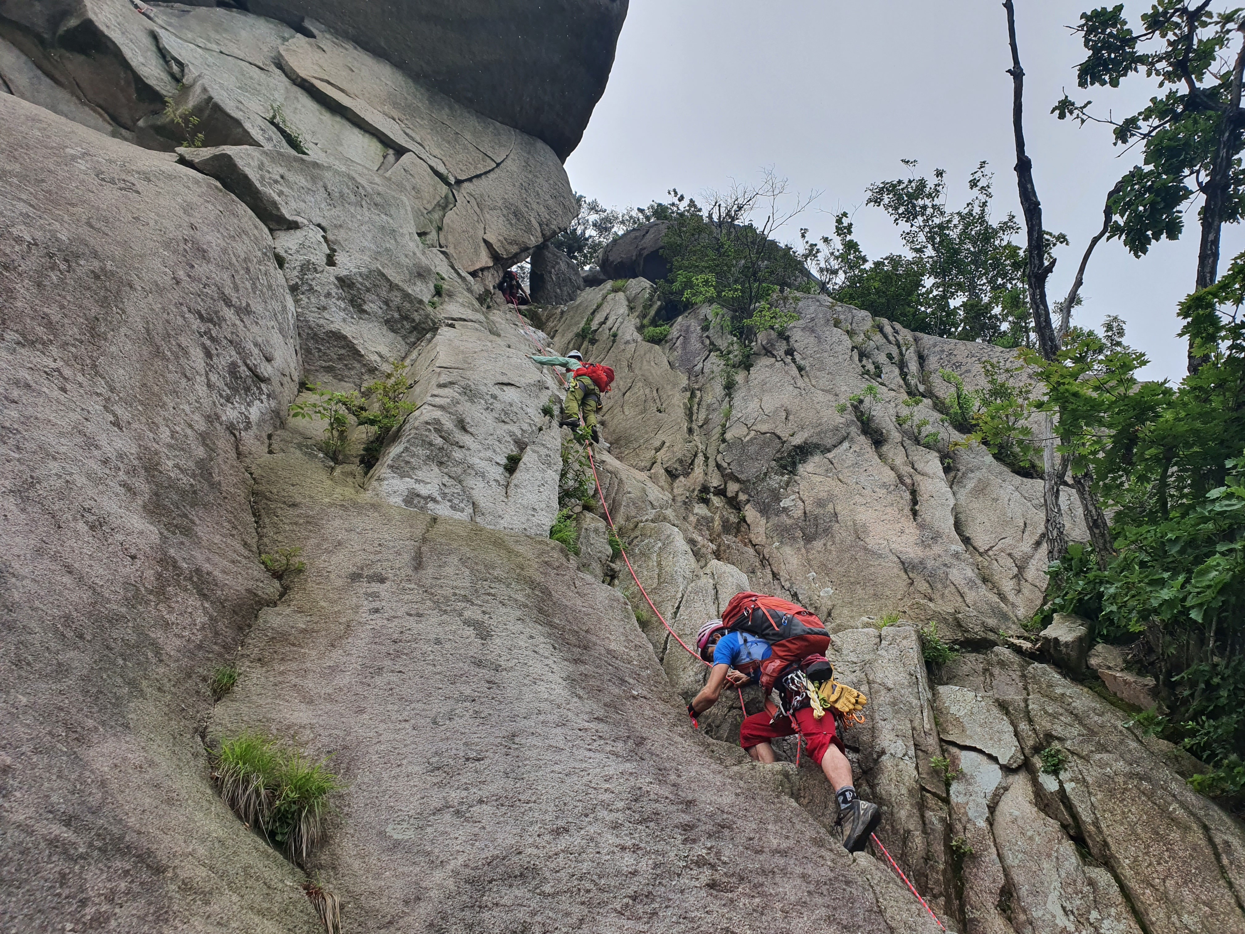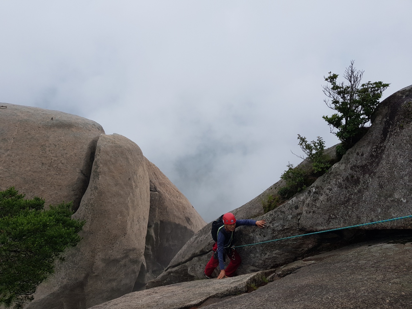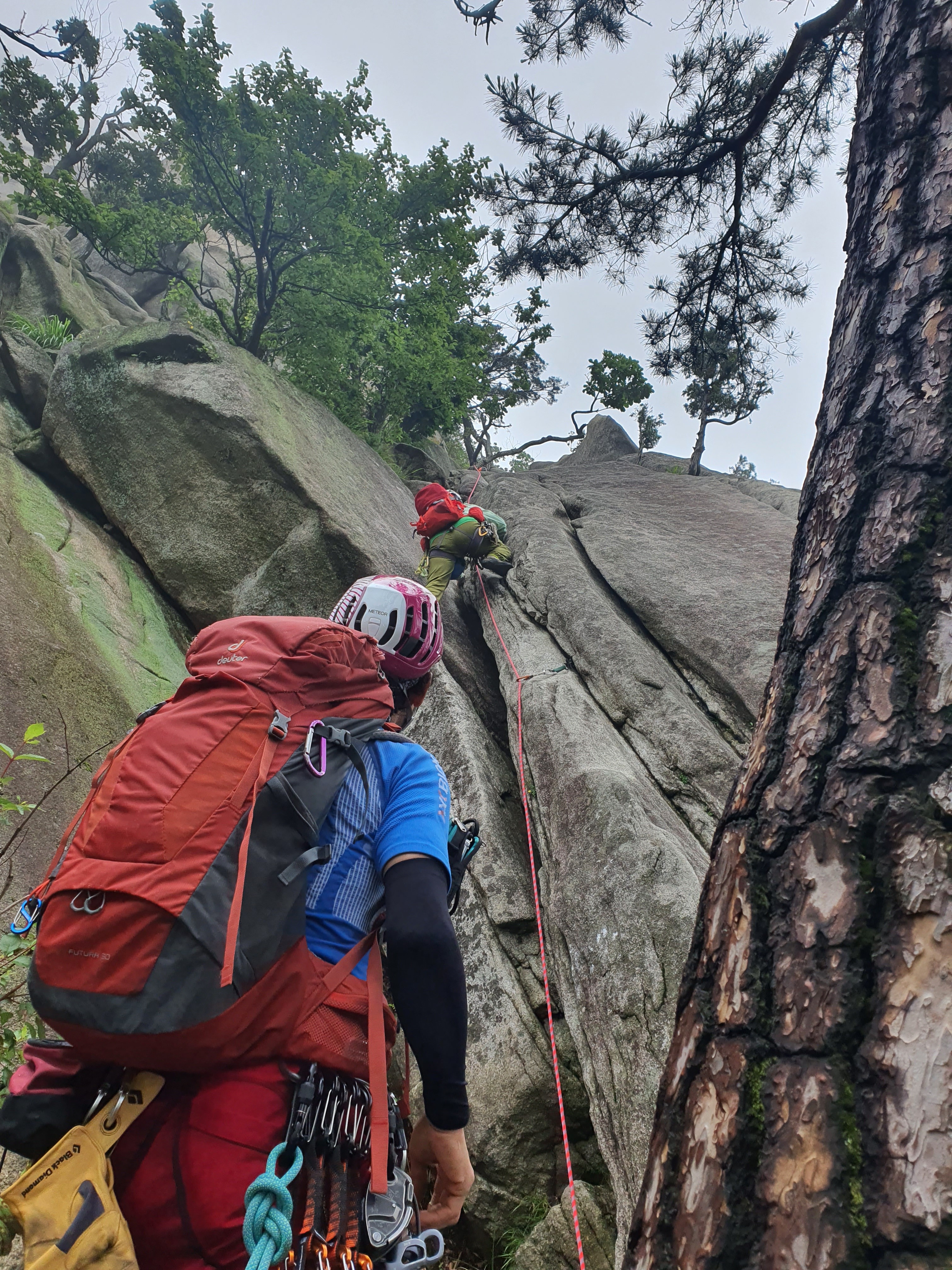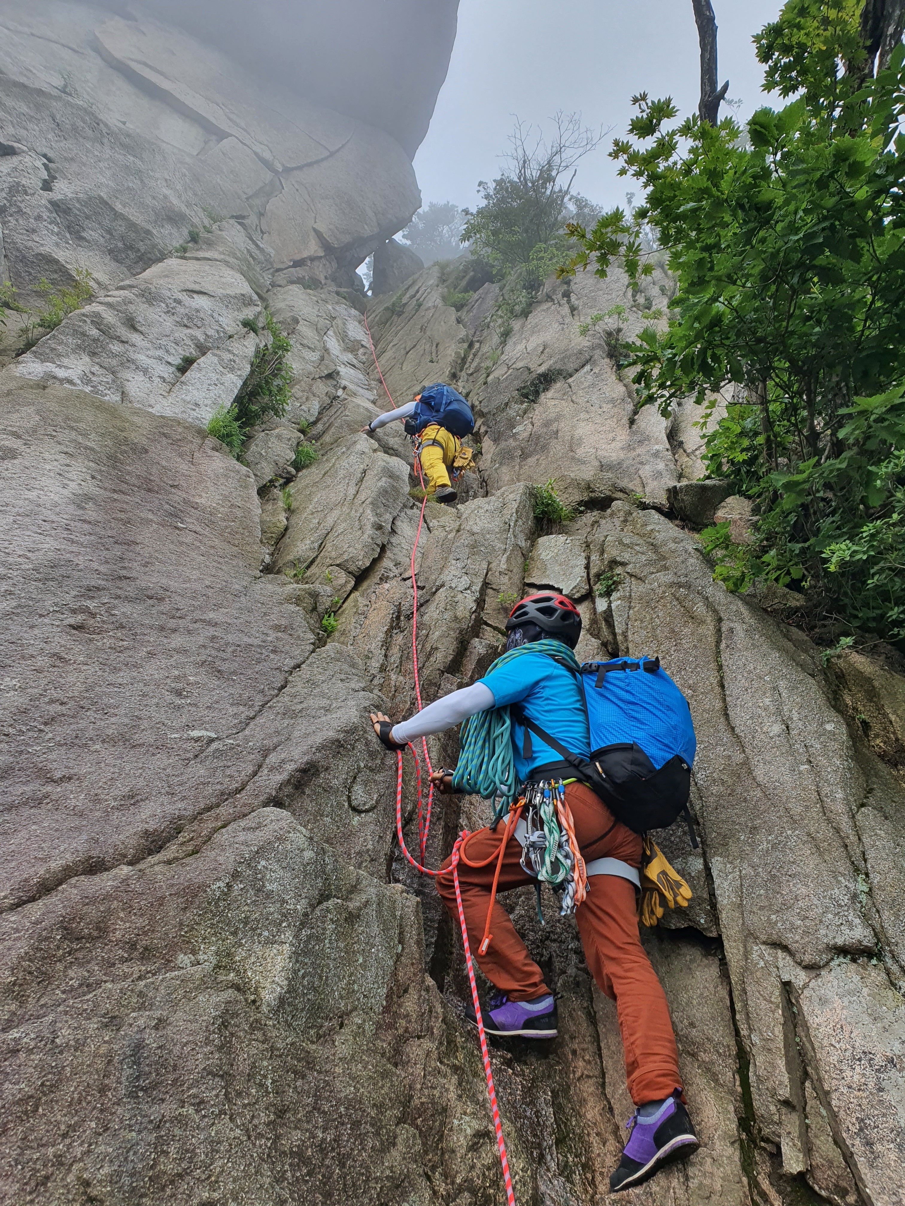 비에 젖은 참기름 바위는 얼마나 미끄러운지 사투끝에 밑에서 후배들이 발을 받쳐주어 겨우 내가 먼저 올랐다.