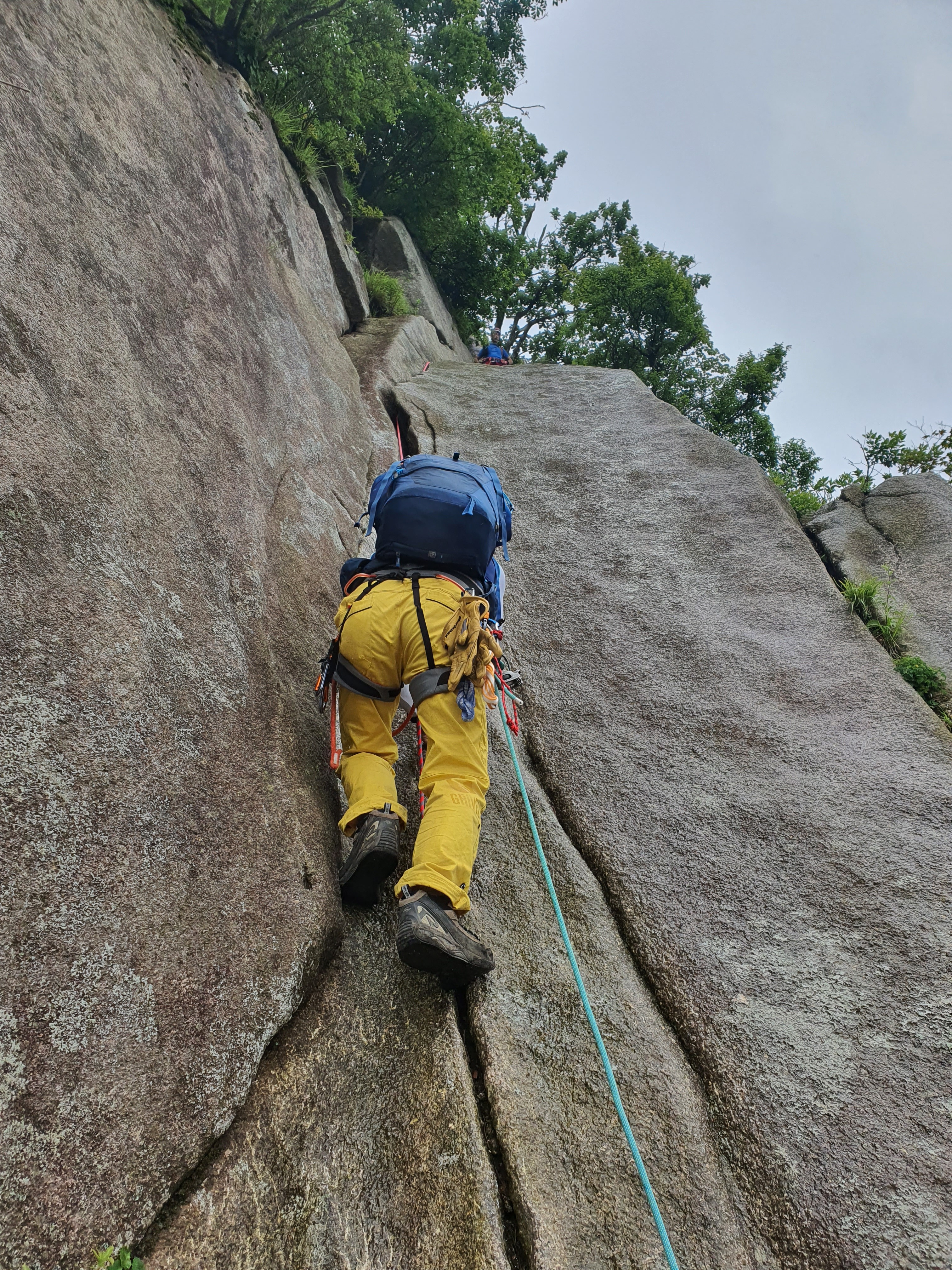 가랑비가 부슬부슬 내리는 가운데 대슬랩의 아래쪽에 도착한다. 역시나 바위가 비에 젖어 있다.