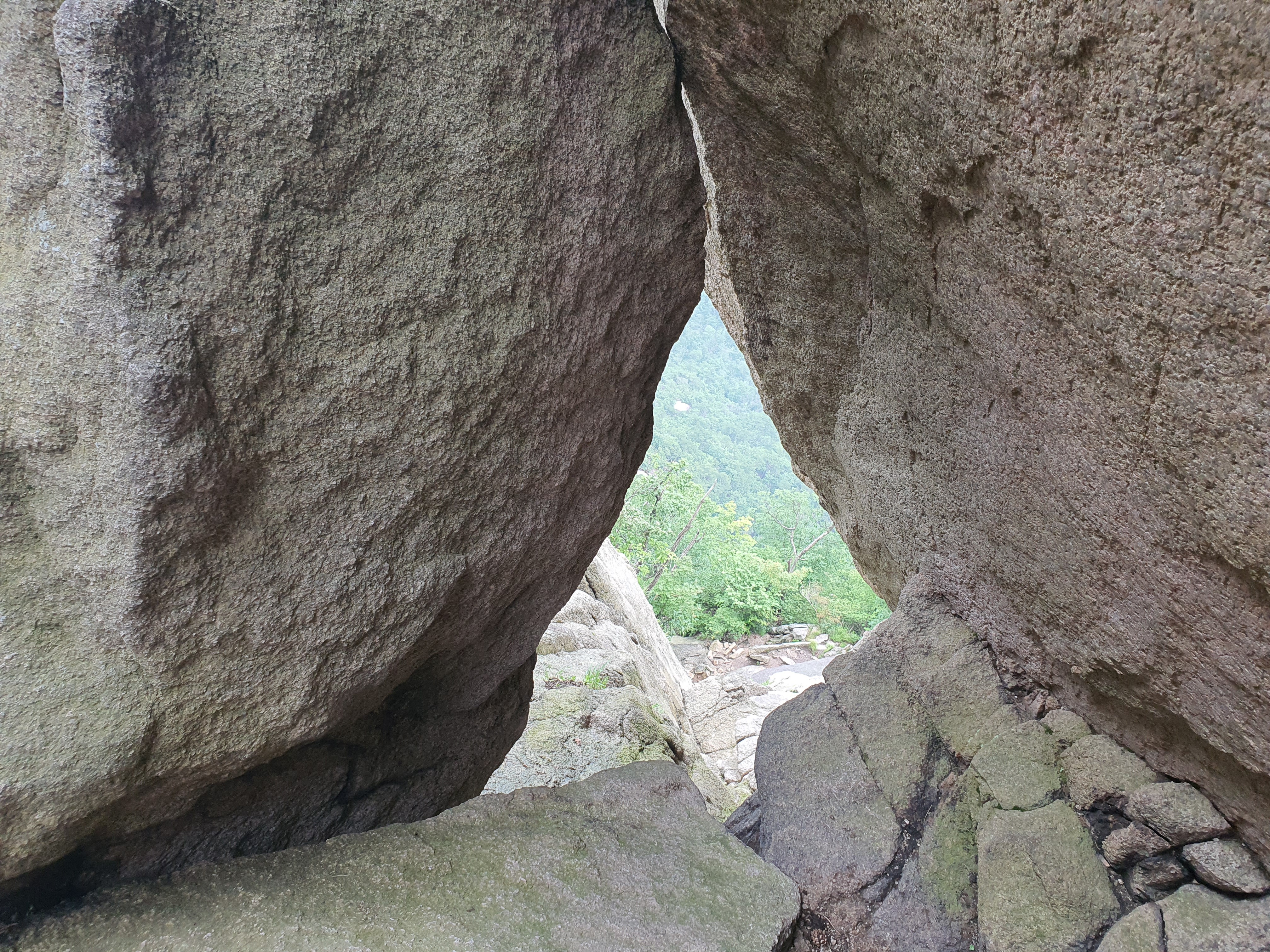 바위 틈새로 바라 본 풍경~ 도봉산쪽이 안개에 가려서 보이지 않는다.