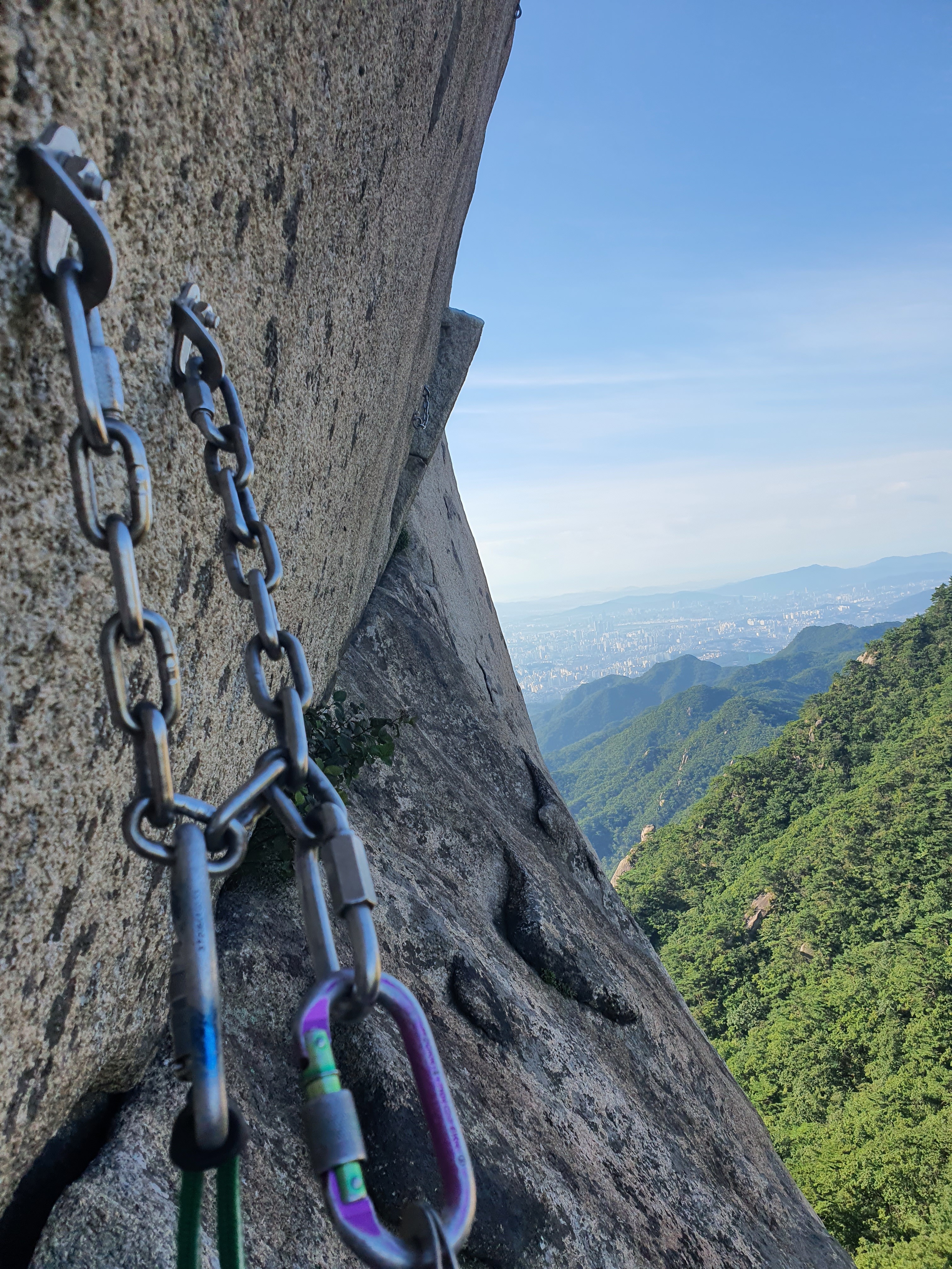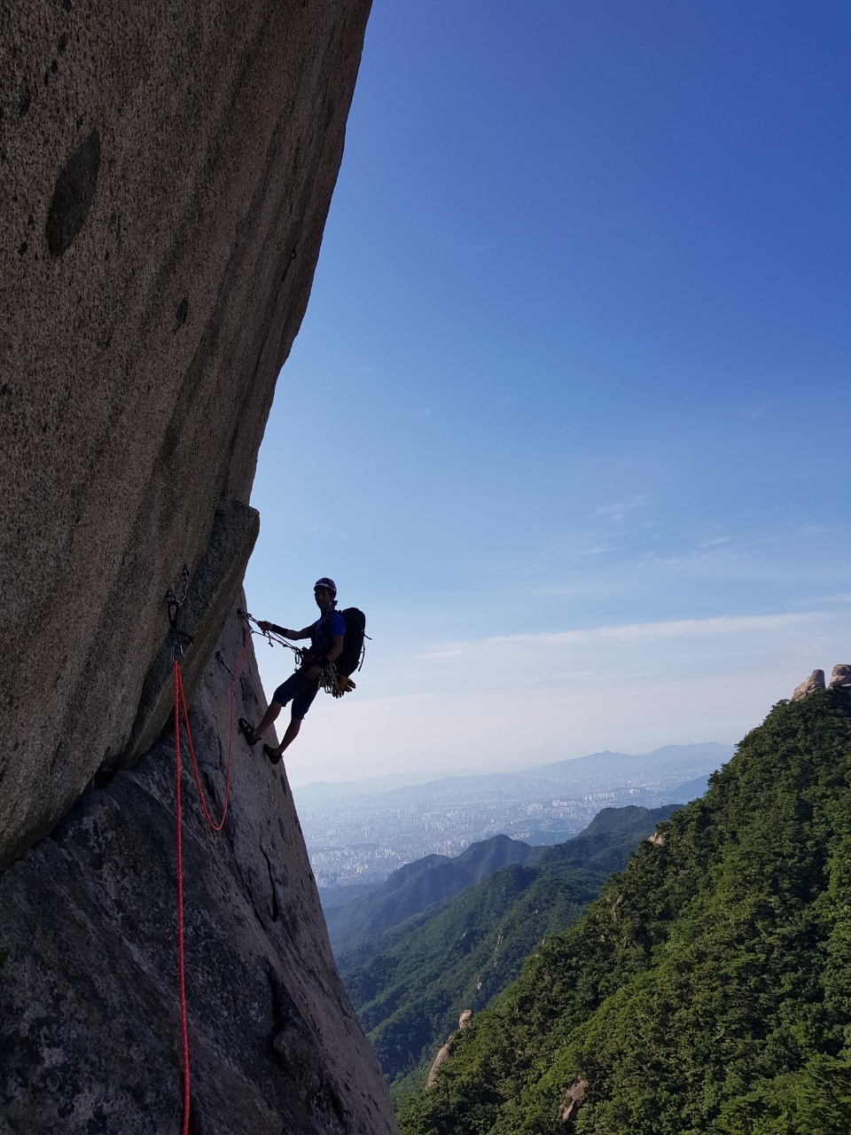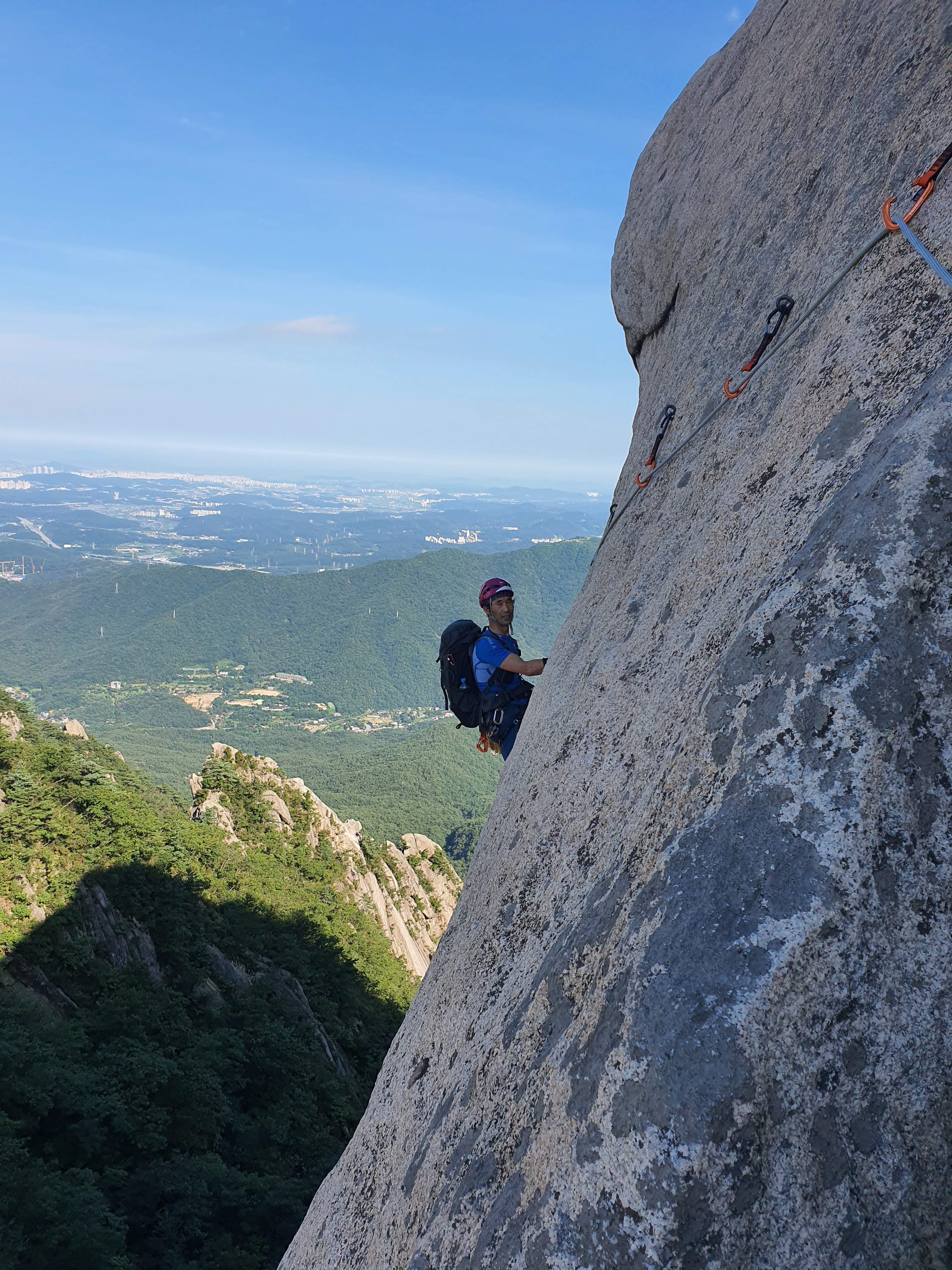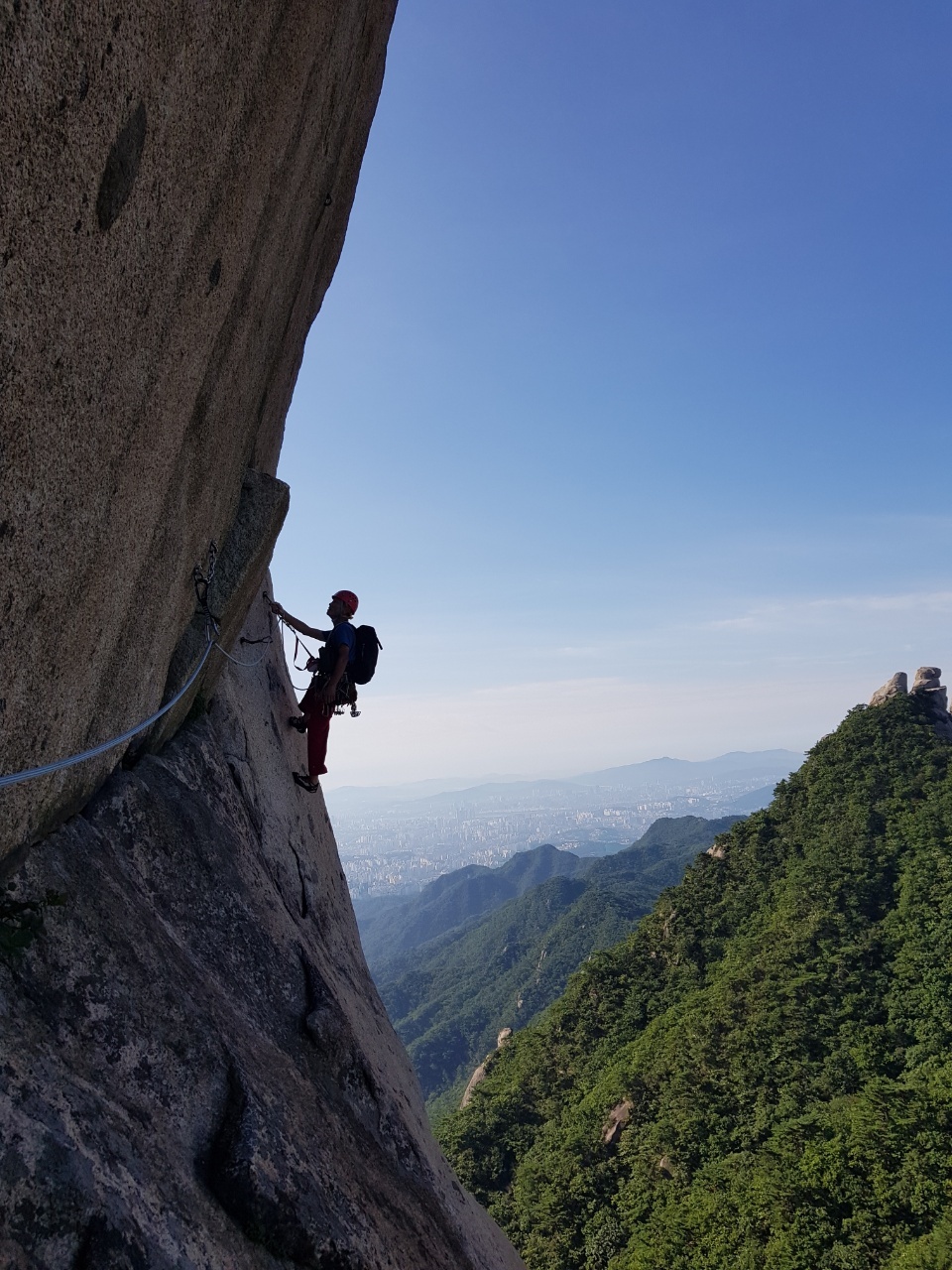 오버행 아래에 설치된 확보지점에 도착하고 건너편으로 이어지는 횡단 루트를 바라본다. 건너편인 백운대에서 바라 보면