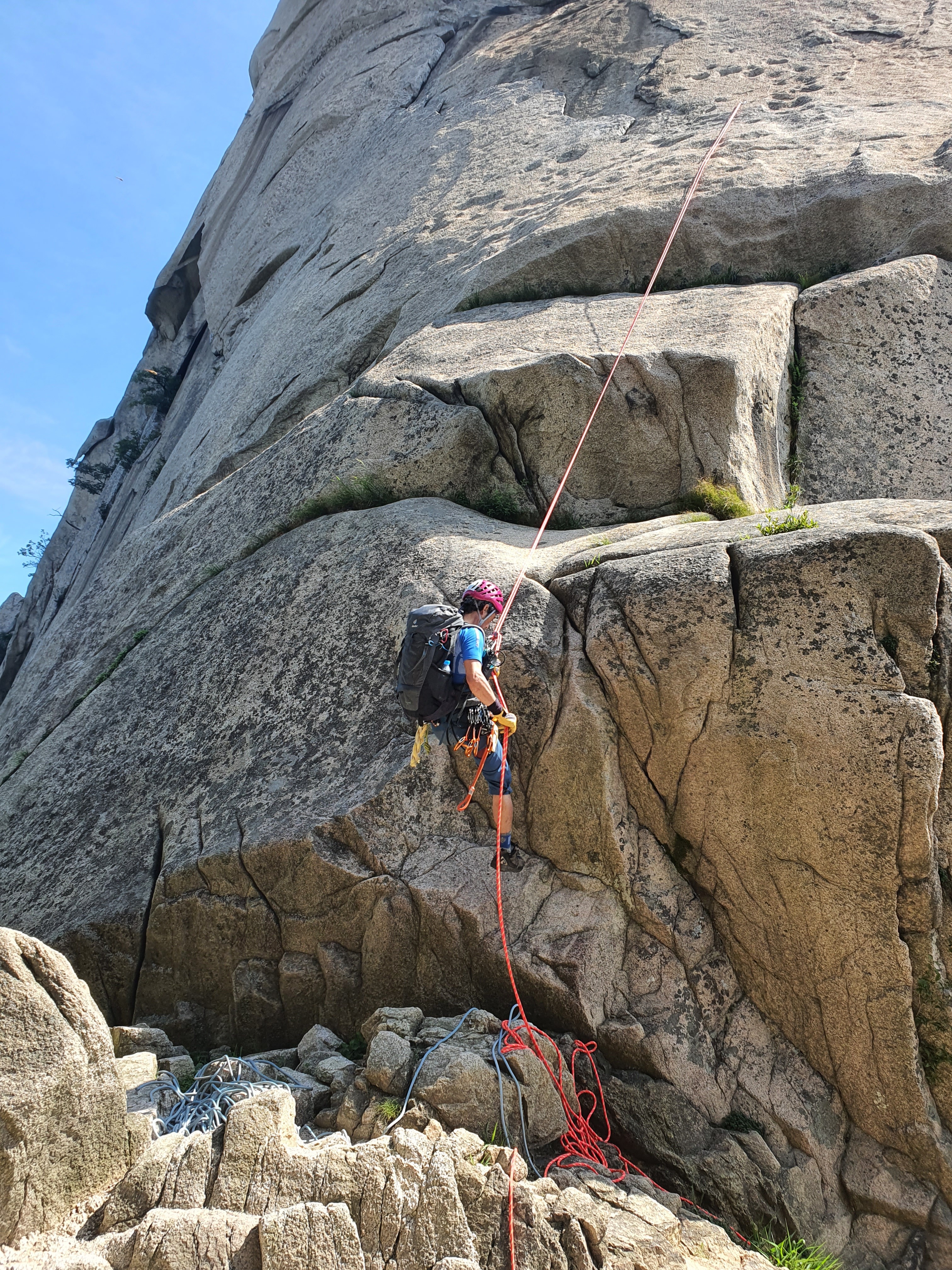 여기는 빤빤한 직벽처럼 보이는데 사실 안쪽으로 패어 들어간 경사지고 작은 테라스가 있는 곳이라서 앉아서 쉴수도 있다.