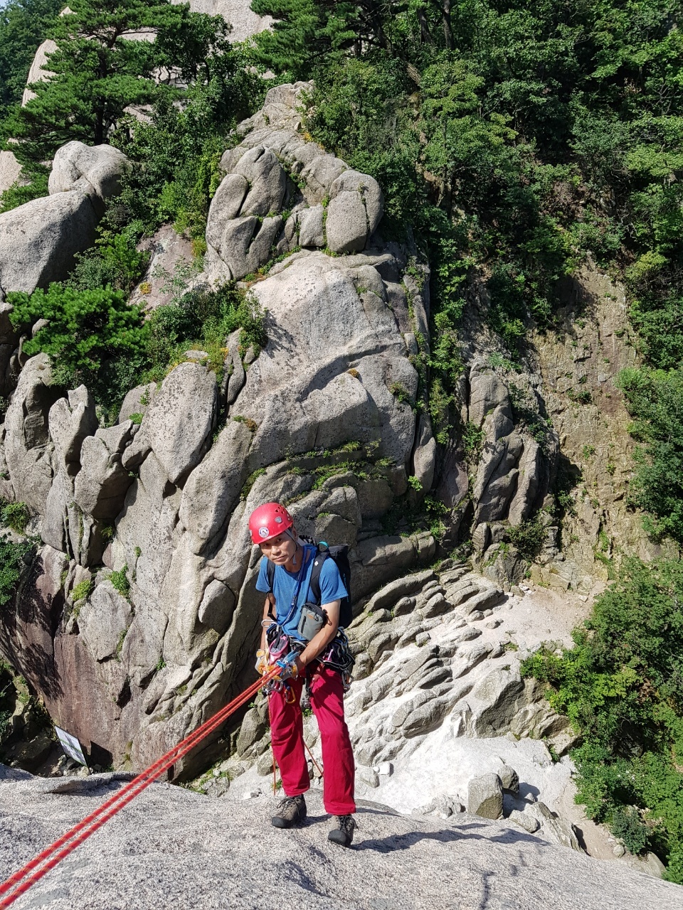 대슬랩 아래에 선 강걸순 후배~ 상단부 오른쪽에 의대길과 취나드a 코스가 보이고 중간에 작은 숲이 보이는 곳이