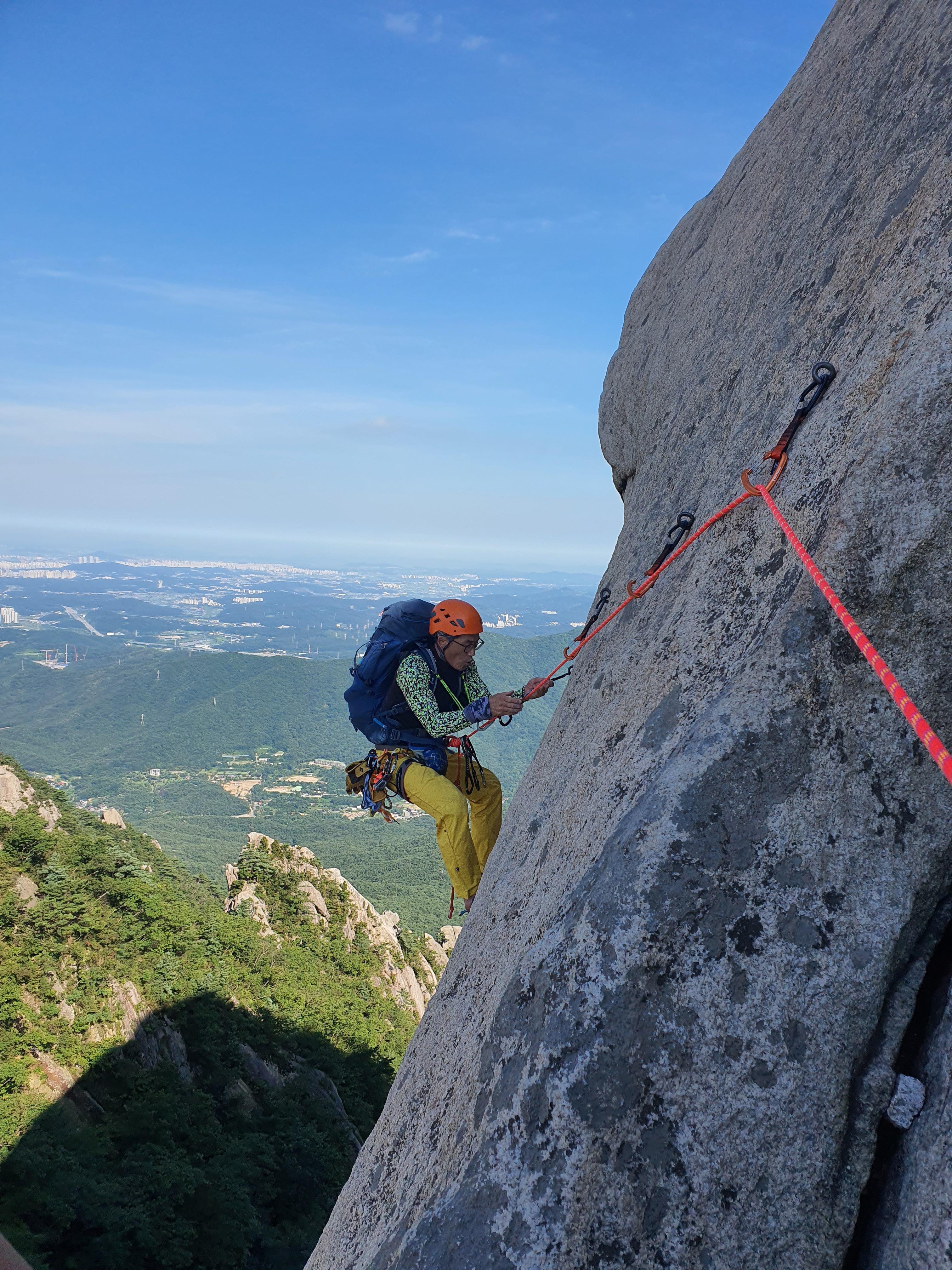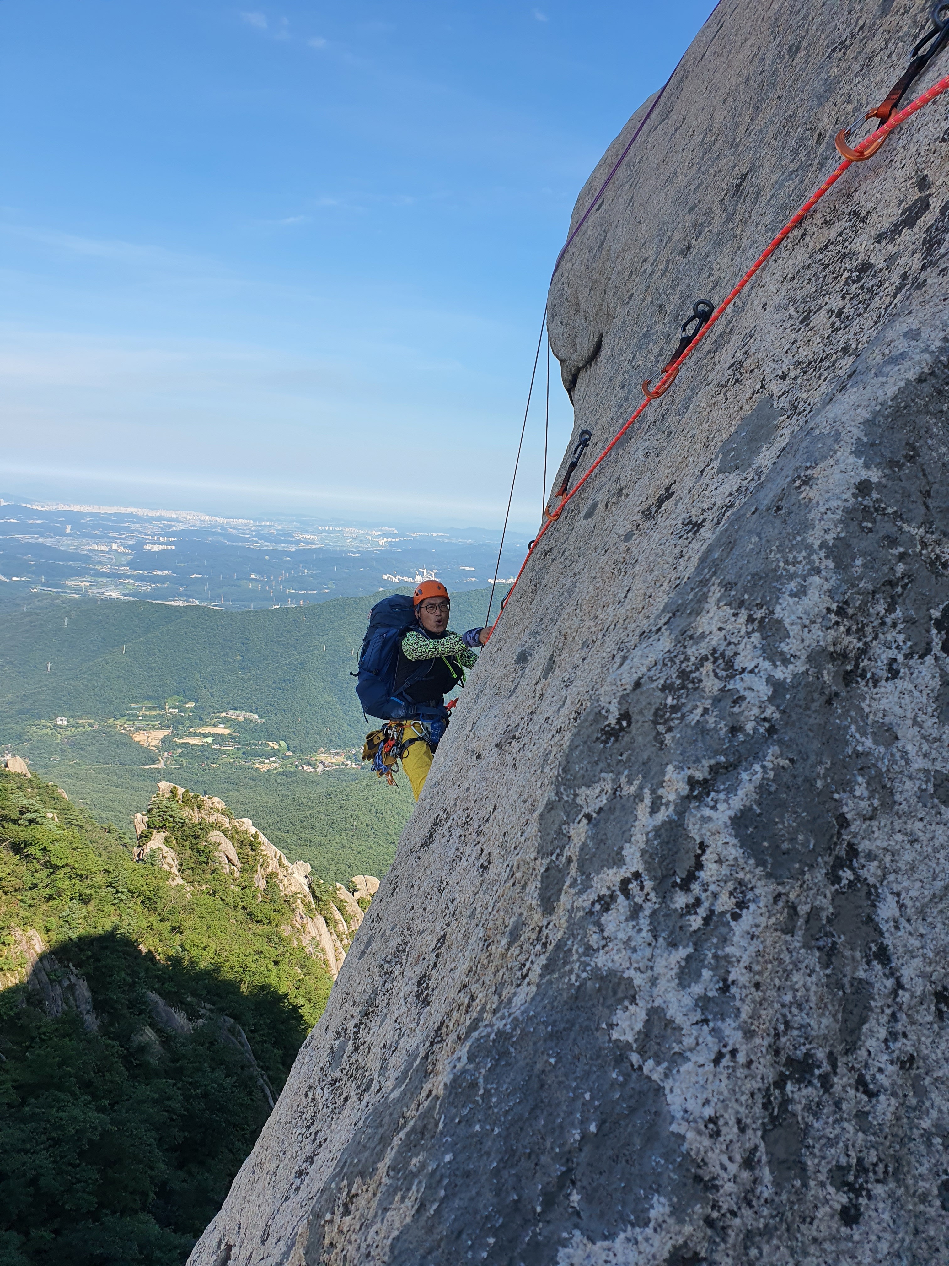 내가 올라간 후 두 번째로 직벽 크랙을 올라 오는 후배~ 저 위쪽에 보이는 쇠말뚝은 낙석 방지를 위해