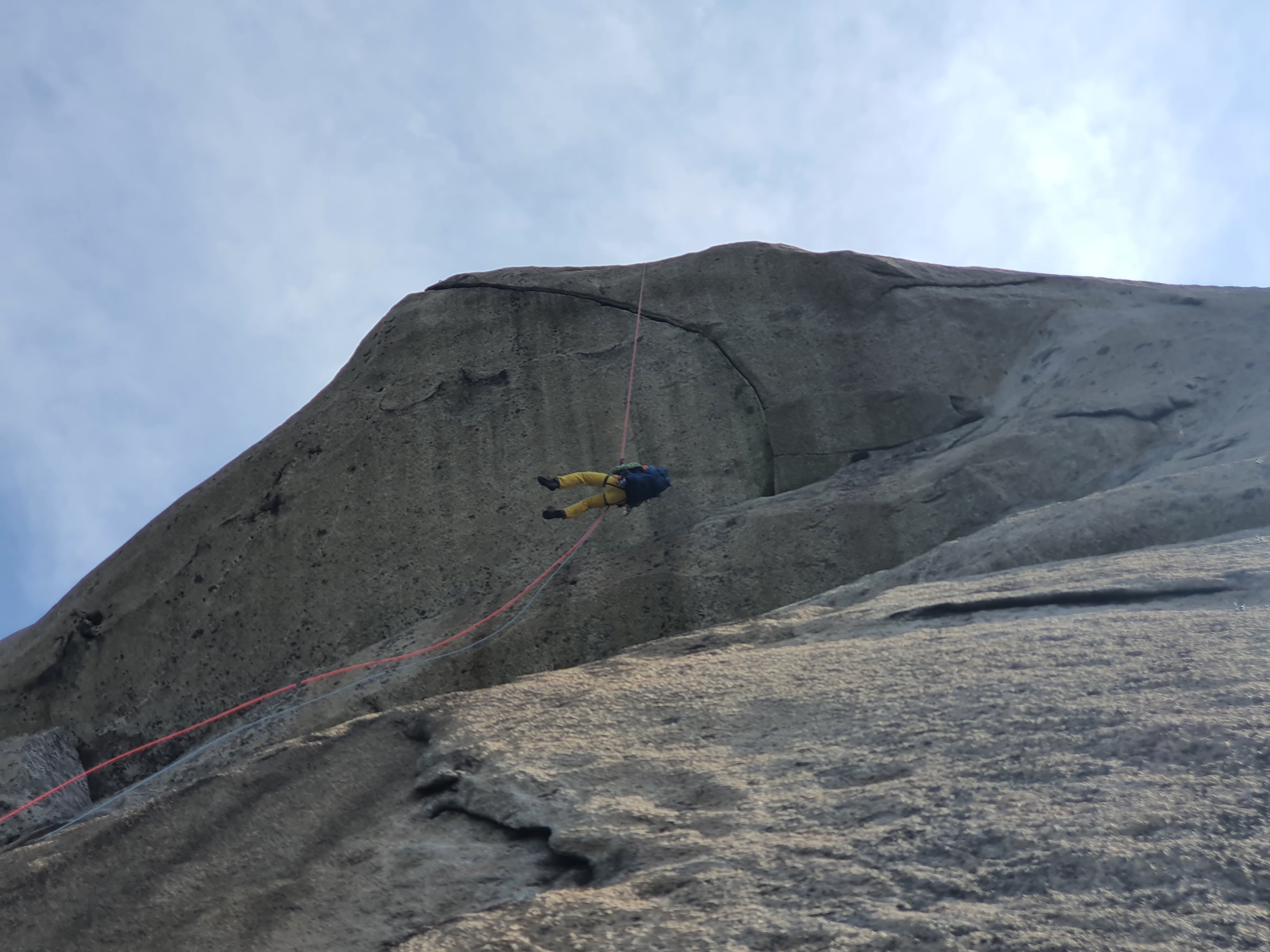두 번에 걸쳐서 하강을 할 계획이므로 하단부의 확보점에서 후배들을 기다린다.
