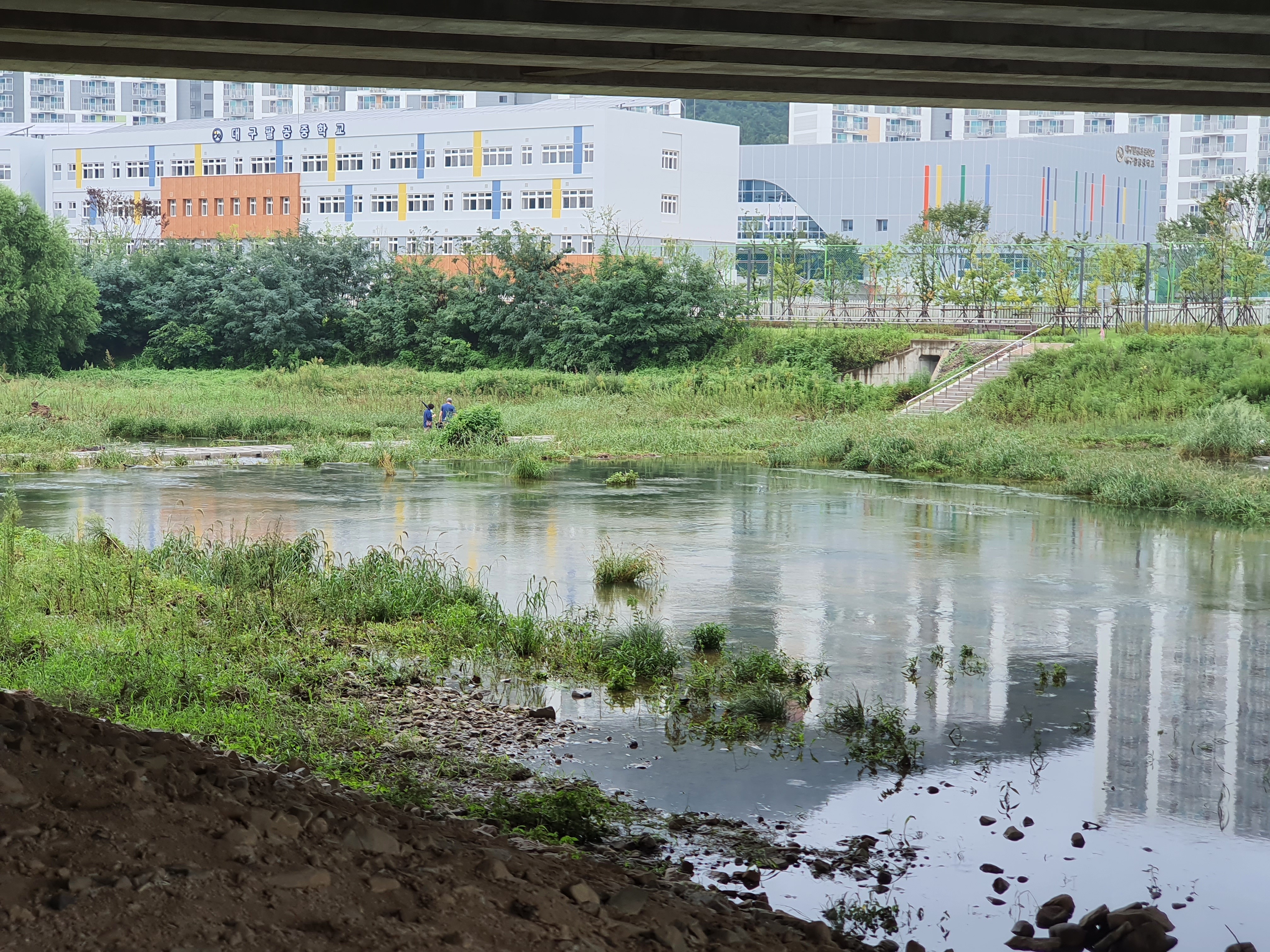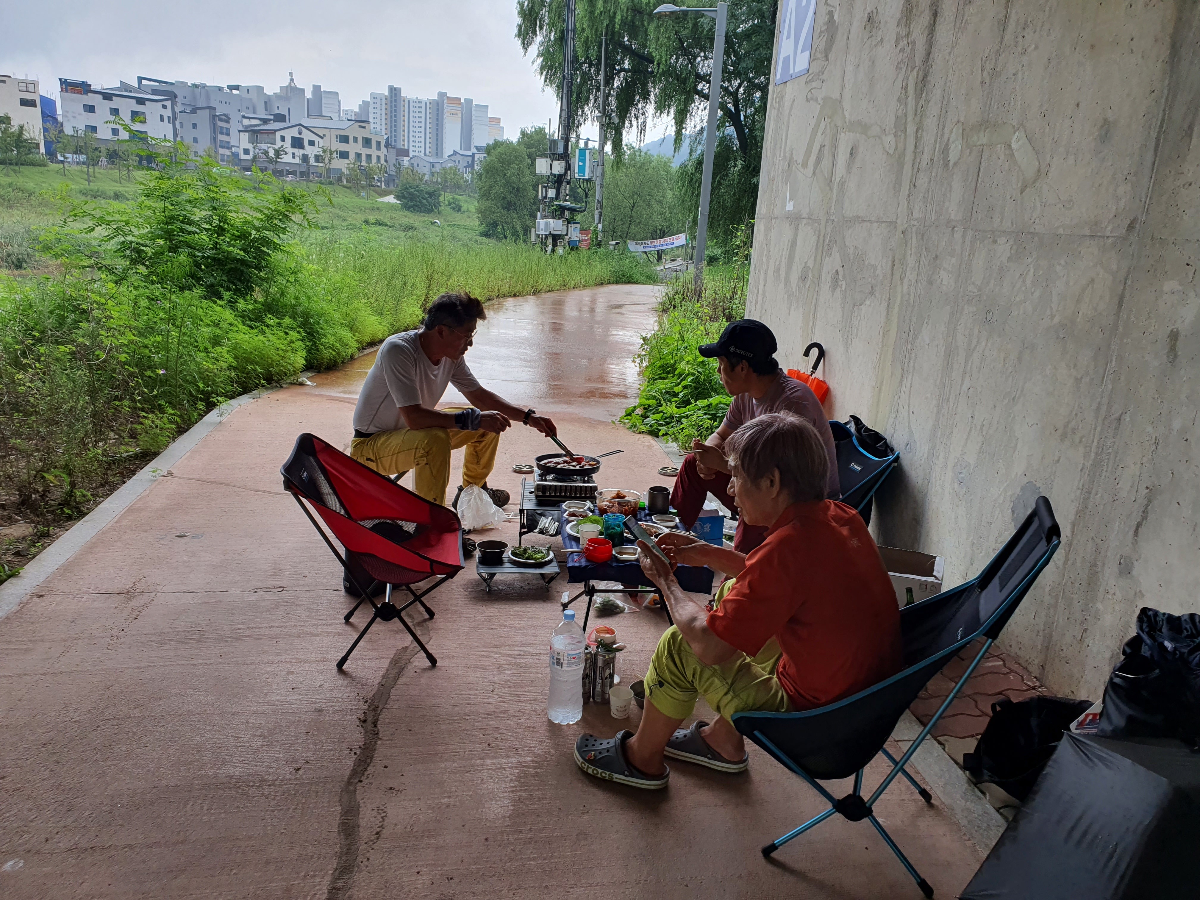 비내리는 개천의 다리 아래에서의 즐거운 시간~ 날씨도 시원하다~