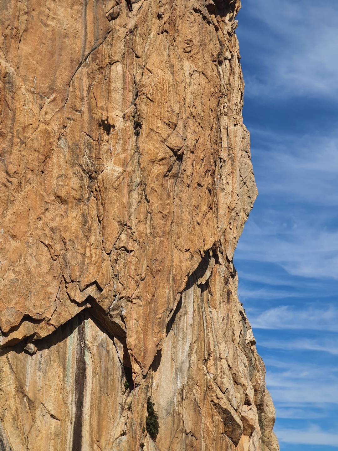 적벽 중앙에 채송화의 향기 길(5.11a)를 등반하는 2인 1조 팀의 등반자들이 보인다~
